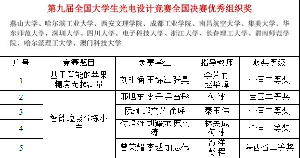 8月31日,2021年第九届全国大学生光电设计竞赛全国总决赛在深圳大学圆满落幕,此次竞赛全国七个赛区,共有227所高校,1925支参赛队,参赛选手9201名,参赛队伍数和人数再创新高。经过重重选拔和激烈角逐,物理与电气工程学院有4支参赛团队首次入围国赛,并获得全国二等奖4项和“优秀组织奖”的佳绩。