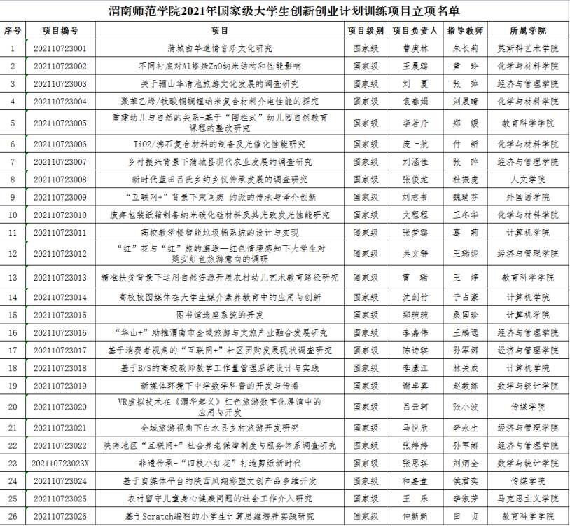 近日,教育部下发了《关于公布2021年国家级大学生创新创业训练计划项目和重点支持领域项目名单的通知》(教高司函〔2021〕13号),伟德官网《蒲城白羊道情音乐文化研究》等26个项目获批2021年国家级大学生创新创业训练计划项目立项。