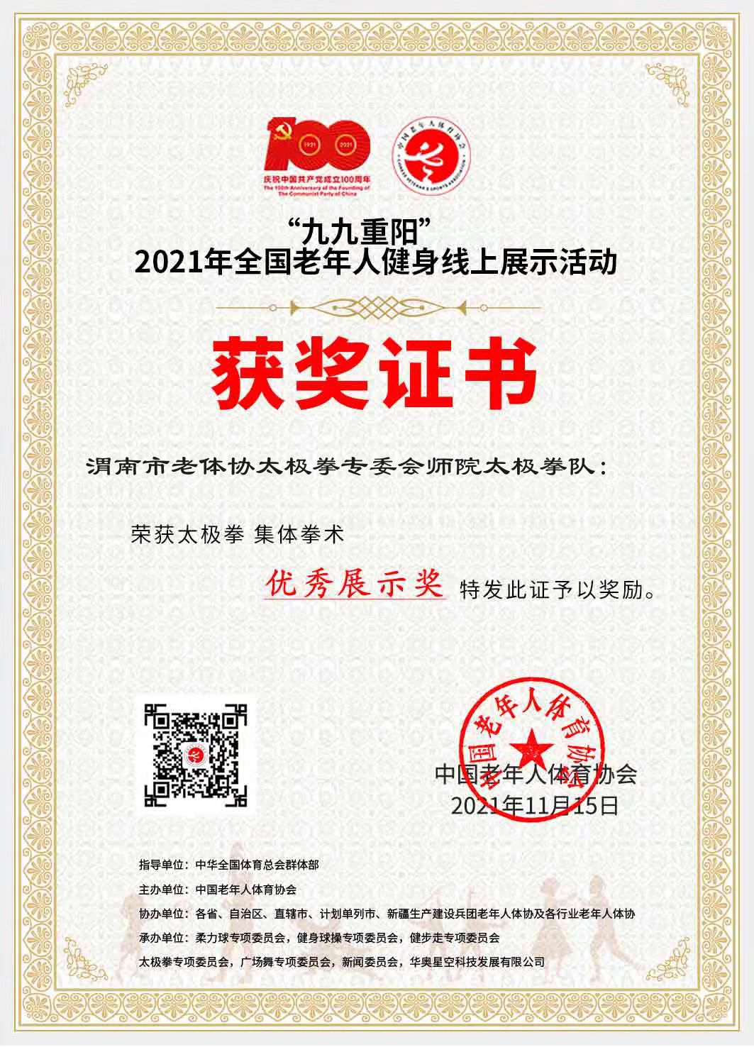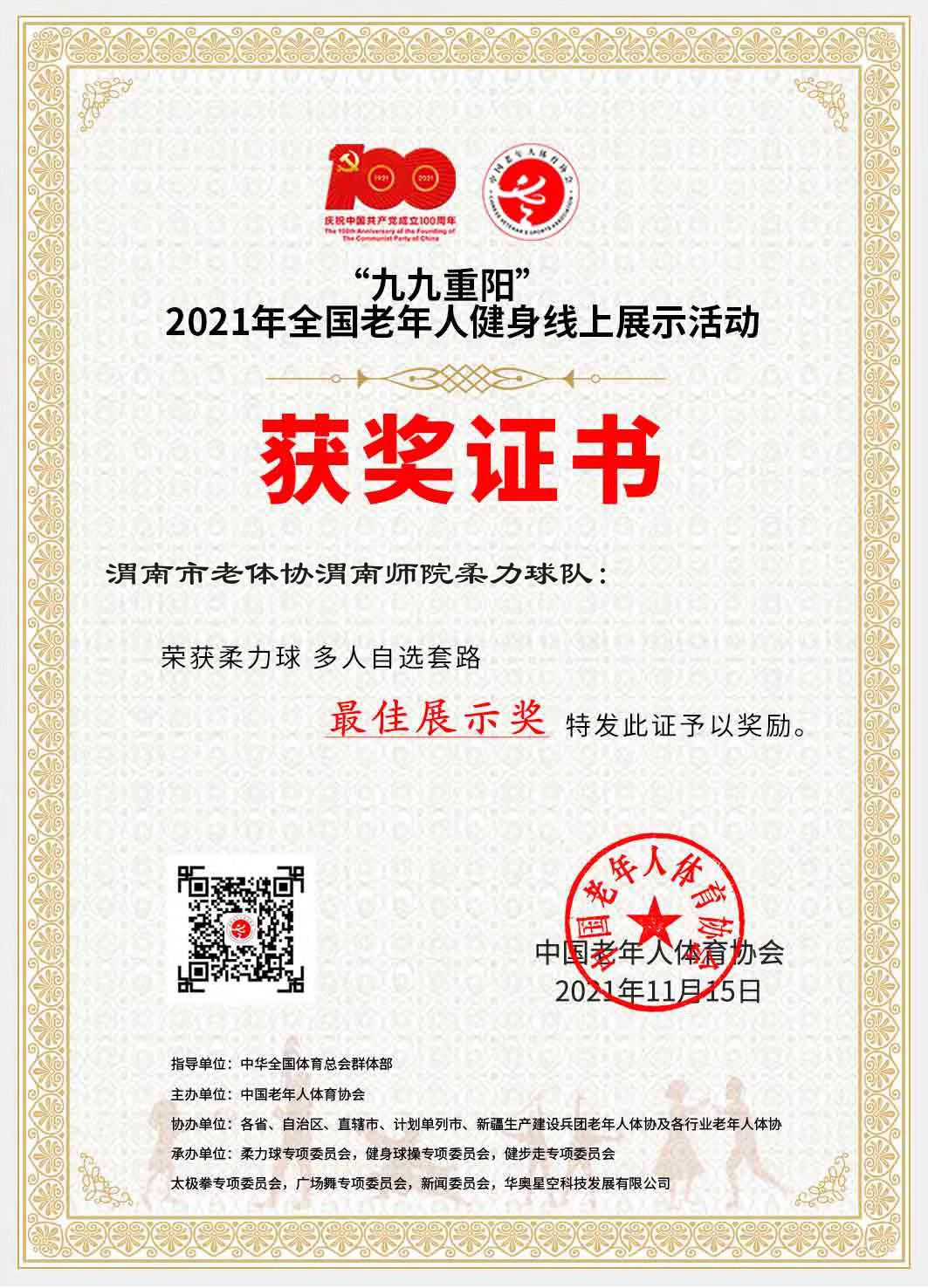 近日,伟德官网离退休工作处老年艺术团参加“九九重阳”2021年全国老年人健身线上展示活动,其中,伟德官网柔力球队“最美不过夕阳红”荣获“自选套路最佳展示奖”; 拳剑队的“32式太极剑”荣获“太极拳集体器械优秀展示奖”, 拳剑队的“24式太极拳”荣获“太极拳集体拳术优秀展示奖”。