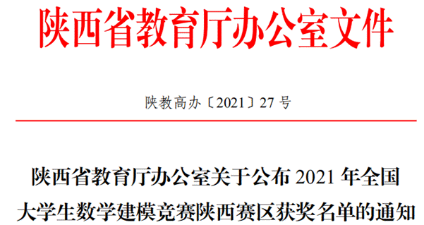 近日,陕西省教育厅办公室发文公布了2021年全国大学生数学建模竞赛陕西赛区获奖名单,伟德官网有44支队伍参加本次竞赛,22支队伍获奖(获奖率50%),其中杨涛涛、官辰雨、冯佳瑜三位同学组成的参赛队喜获全国一等奖,李雨蔓、冯易炫、罗星美同学组成的参赛队荣获全国二等奖。另外,伟德官网有4支参赛队喜获陕西赛区一等奖,16支参赛队伍喜获陕西赛区二等奖,刘炳全荣获陕西赛区优秀指导教师。