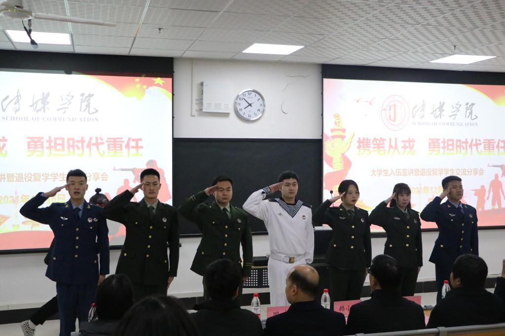 传媒学院退役复学学生代表杨韶烨、皱乐、张浩楠、周翔、朱明珍、郭鑫雅围绕入伍前后的思想转变、军队生活对自己的磨练、参军优待政策、退役复学后学习生活情况等方面,向同学们分享了他们的从军之梦、军人之路、报国之志。他们表示,复学后将继承和发扬人民军队的光荣传统,退伍不褪色,用自身的成长经历、精神追求、模范行动为身边的同学做好表率。他们的精彩分享感染了每一位同学,赢得了现场的阵阵掌声。