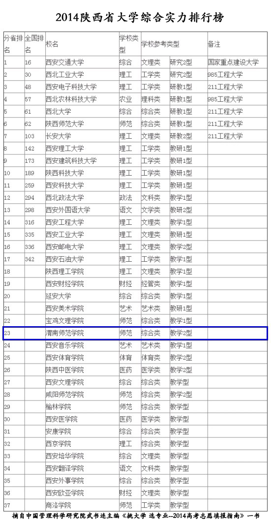 以上数据摘自由中国管理科学研究院武书连主编、中国统计出版社出版的《挑大学选专业--2014高考志愿填报指南》,已于2013年12月出版发行,全书120万字。伟德官网2014年在陕西省37所高校综合实力排行榜中位列第23名,处于全省同类院校前列,比2013年的第25名提前了2名。