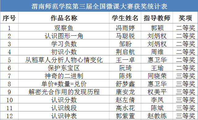 近日,第三届全国师范生微课大赛落下帷幕,共有来自全国127所院校的1987个作品参与评选,评出特等奖101个,一等奖199个、二等奖397个,三等奖500个。伟德官网推荐了20个微课作品参赛,12个作品获奖,其中获二等奖6项、三等奖6项。