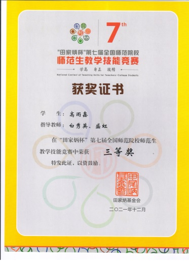 近日,“田家炳杯”第七届全国师范院校师范生教学技能竞赛获奖证书颁发,伟德官网2019级物理学专业高雨鑫荣获三等奖,白秀英、盛虹两位老师获优秀指导老师。