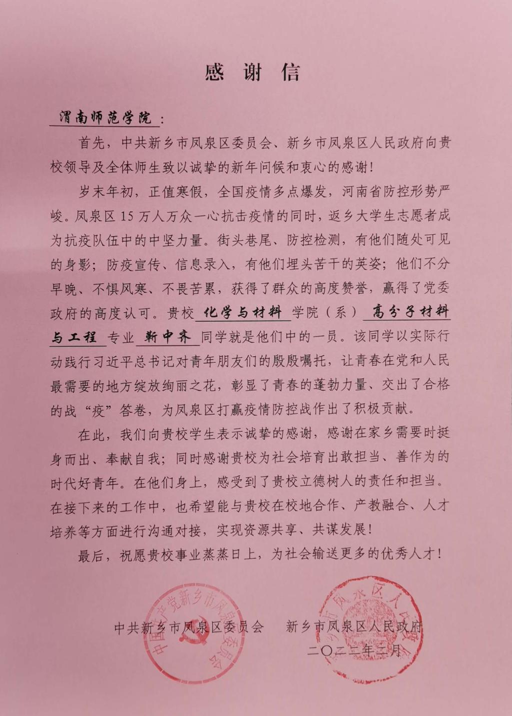 近日,伟德官网收到新乡市凤泉区人民政府的感谢信,信中感谢化学与材料学院高分子材料与工程211班靳中齐同学在家乡需要时挺身而出,奉献自我,该同学以实践行动践行习近平总书记对青年朋友们的殷殷嘱托,让青春在党和人民最需要的地方绽放绚丽之花,彰显了青春的蓬勃力量、交出了合格的战“役”答卷,为凤泉区打赢疫情防控战作出了积极贡献;同时感谢伟德官网为社会培养出敢担当、善作为的时代好青年。感谢信中还表示,希望能与伟德官网在校地合作、产教融合、人才培养等方面进行沟通对接,实现资源共享、共谋发展!