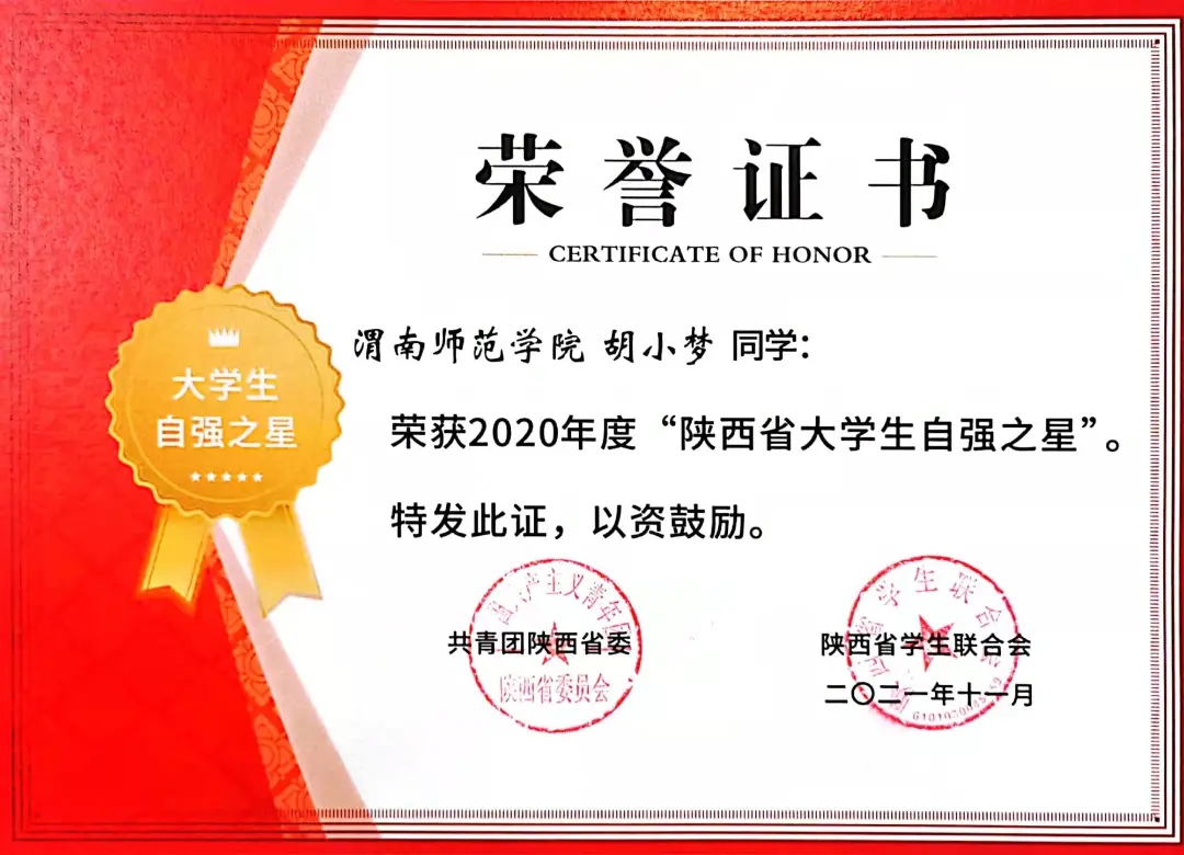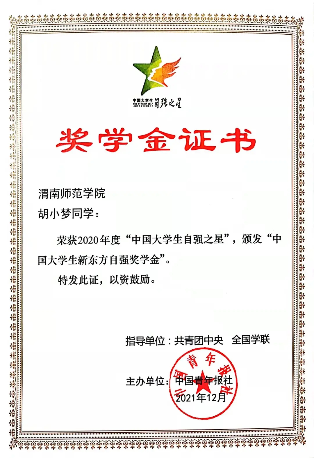 为弘扬自强精神,激励青年奋勇争先,由共青团中央、全国学联指导,中国青年报社、新东方教育科技集团联合开展的2020年度“中国大学生自强之星评选结果于近期揭晓。伟德官网汉语言文学专业201班“向日葵女孩”胡小梦同学荣获2020年度“中国大学生自强之星”、“陕西省大学生自强之星”,同时获得“中国大学生新东方自强奖学金”。