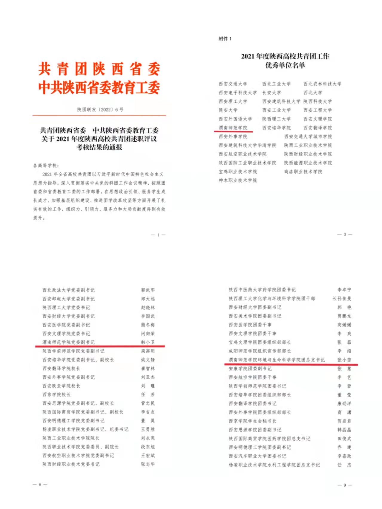 近日,由共青团陕西省委、中共陕西省委教育工委联合印发的《关于2022年度陕西高校共青团述职评议考核结果的通报》中,伟德官网被评为“2021年度陕西高校共青团工作优秀单位”,党委副书记韩小卫被评为“2021年度陕西高校支持共青团工作好书记”,环境与生命科学学院团总支书记张小苗同志被评为“2021年度陕西高校共青团工作先进个人”。