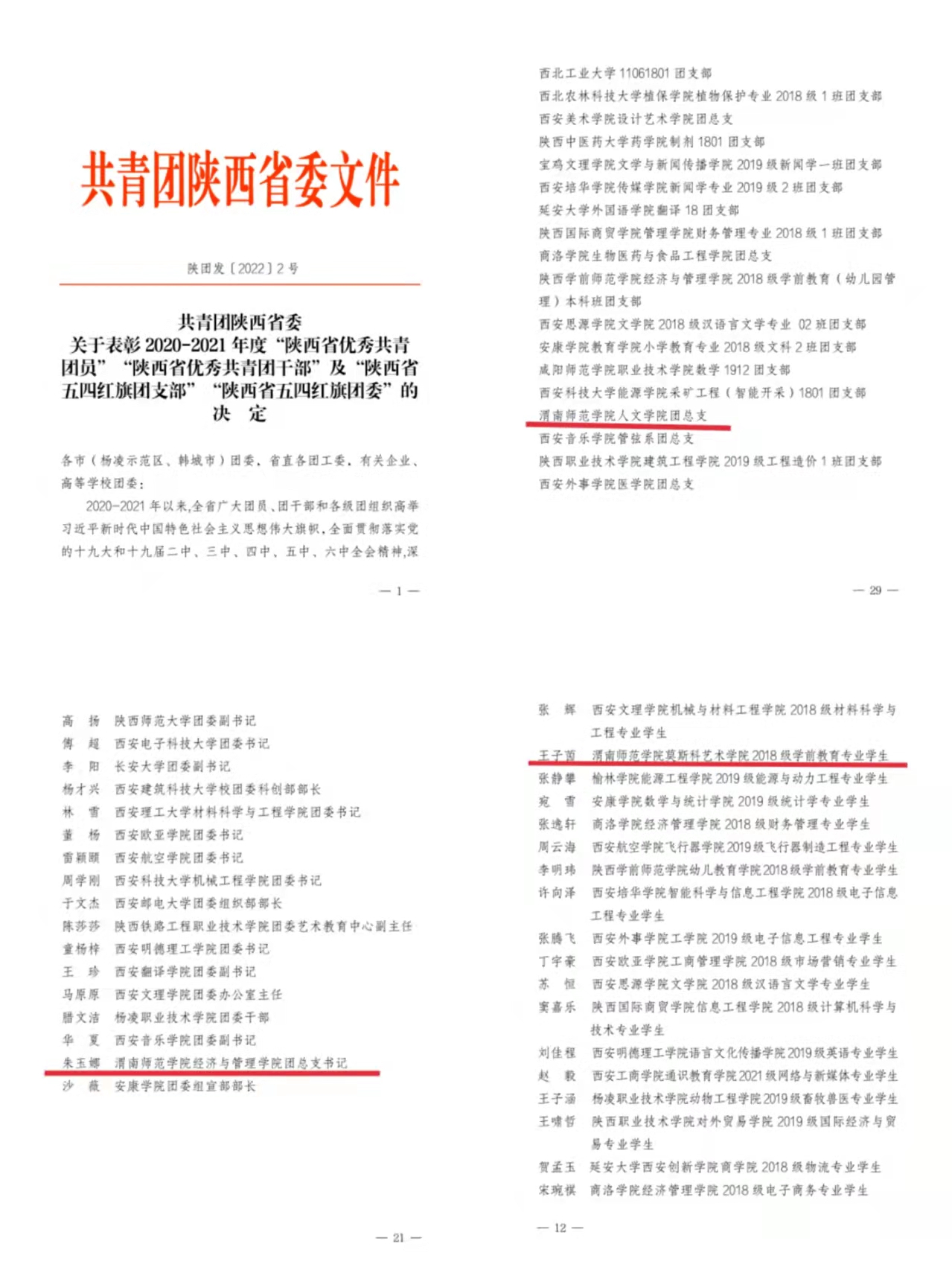 由共青团陕西省委印发的《关于表彰2020-2021年度“陕西省优秀共青团员”“陕西省优秀共青团干部”及“陕西省五四红旗团支部”“陕西省五四红旗团委”的决定》中,伟德官网人文学院团总支获得2020-2021年度“陕西省五四红旗团支部”,经济与管理学院团总支书记朱玉娜获得2020-2021 年度“陕西省优秀共青团干部”,莫斯科艺术学院2018级学前教育专业学生王子茵获得2020-2021年度“陕西省优秀共青团员”。