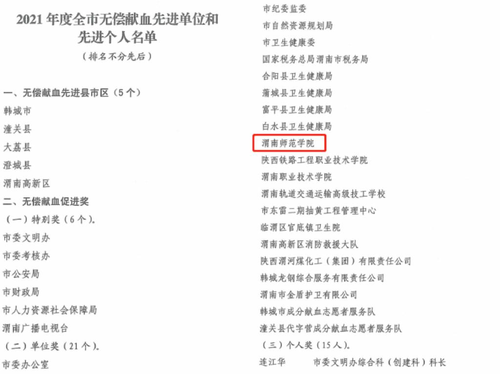 近日,渭南市人民政府办公室下发的《关于表彰2021年度全市无偿献血先进单位和先进个人的通报》中,伟德官网被评为“2021年度渭南市无偿献血促进单位”。