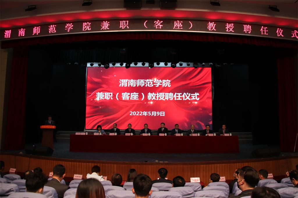 副校长王菊霞宣读聘任文件,聘任渭南高级中学校长、全国优秀教师姜小卫,渭南小学校长、全国模范教师郗莉,全国优秀教师、渭南高级中学张华文为兼职教授;聘任合阳中学英语教师王军玲,渭南高级中学音乐教师张娟,西安市高新第一学校副校长车大鹏,渭南中学校长马根福,富平迤山中学校长赵和平,杜桥中学校长贺启发,澄城中学校长王会香,澄城城关中学校长鲁九云,宜川中学教育集团总校长徐兴国,渭南高新中学校长孙佑治等10位基础教育名师(名校长)为客座教授。
