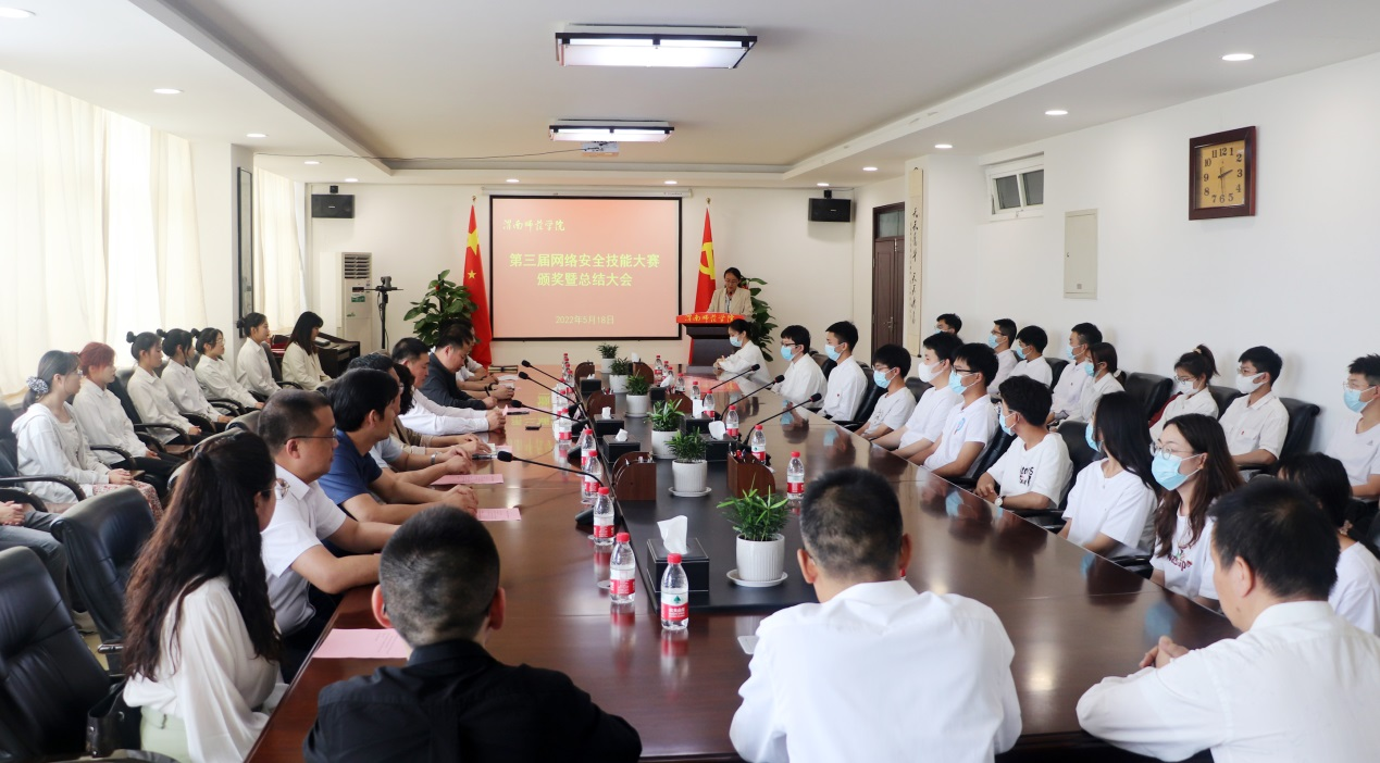 5月18日下午,由学校团委主办、计算机学院承办的伟德国际1949官网第三届网络安全技能大赛颁奖暨总结大会在厚德楼第二会议室举行。学校党委书记卓宇、党委副书记汪勇、副校长王菊霞出席大会,团委副书记肖飞、计算机学院党政负责人、各专业建设负责人、获奖学生等参加大会。大会由计算机学院党总支副书记武楠主持。