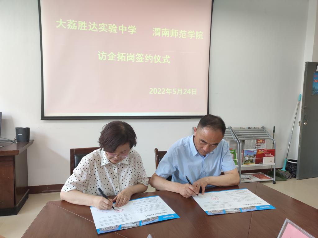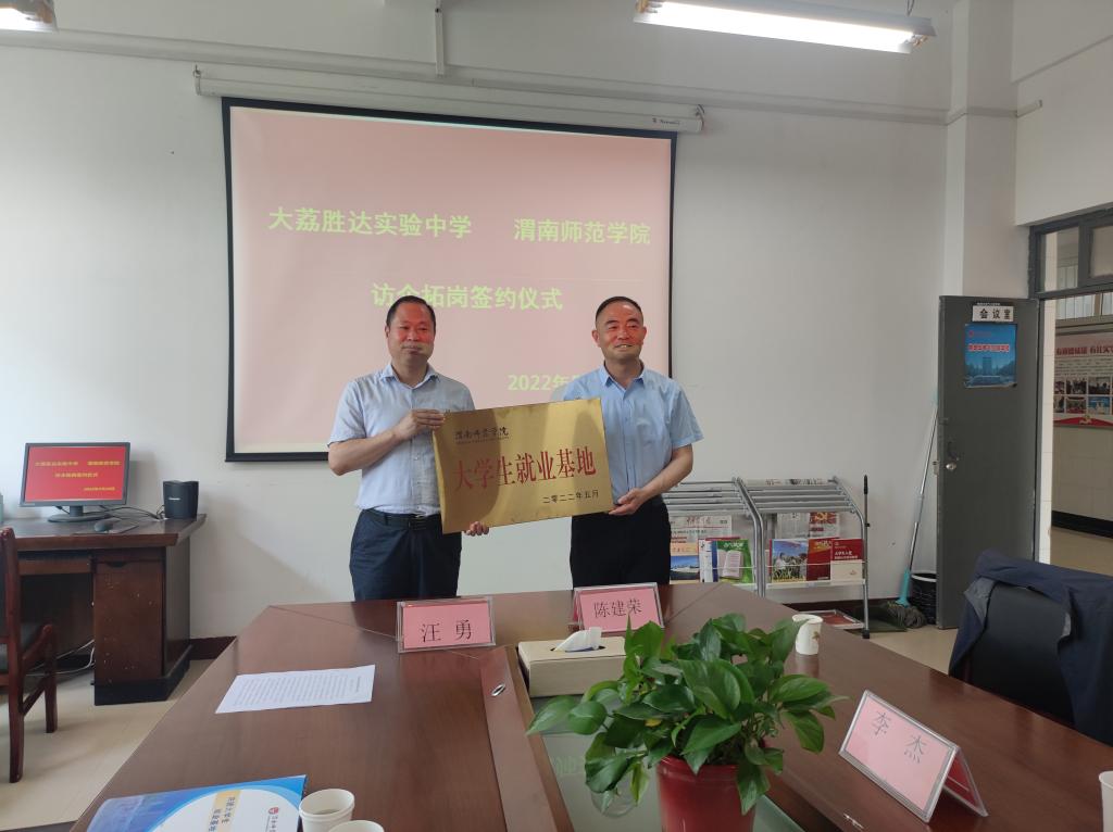 随后,汪勇为大荔胜达实验中学授牌,张晓玲与陈建荣签订了《共建大学生就业基地协议书》。