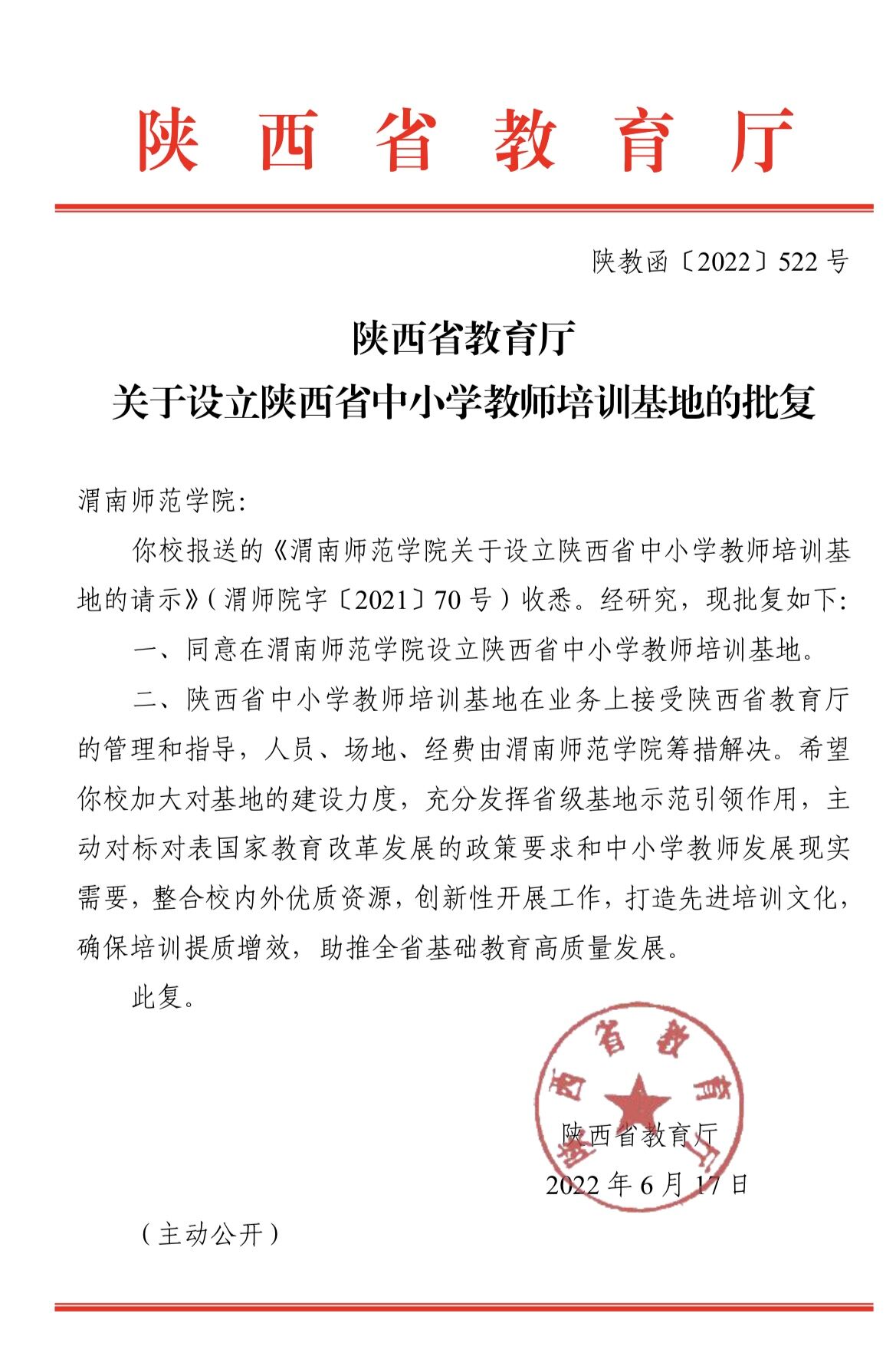 6月17日,陕西省教育厅印发《关于设立陕西省中小学教师培训基地的批复》(陕教函〔2022〕522号),同意在伟德官网设立“陕西省中小学教师培训基地”。这是我省设立的第5个中小学教师培训基地,也是在陕西非省会城市高校中设立的首个基地。
