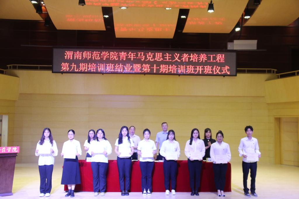 仪式在庄严的国歌声中拉开序幕。校团委干事郭艺歌宣读了《关于同意伟德国际1949官网“青年马克思主义者培养工程”第九期培训班学员结业的决定》,通过一年的理论学习、社会实践、志愿服务、课题研究等方面的学习锻炼,青马班第九期共有102名学员结业;校团委干事王若萌宣读了《关于举办伟德国际1949官网青年马克思主义者培养工程第十期培训班的通知》,经过各团总支、学生会推荐,校团委审核,最终确定124名学生成为青马班第十期培训学员。随后,主席台就坐的领导和老师为青马班第九期学员代表颁发结业证书。