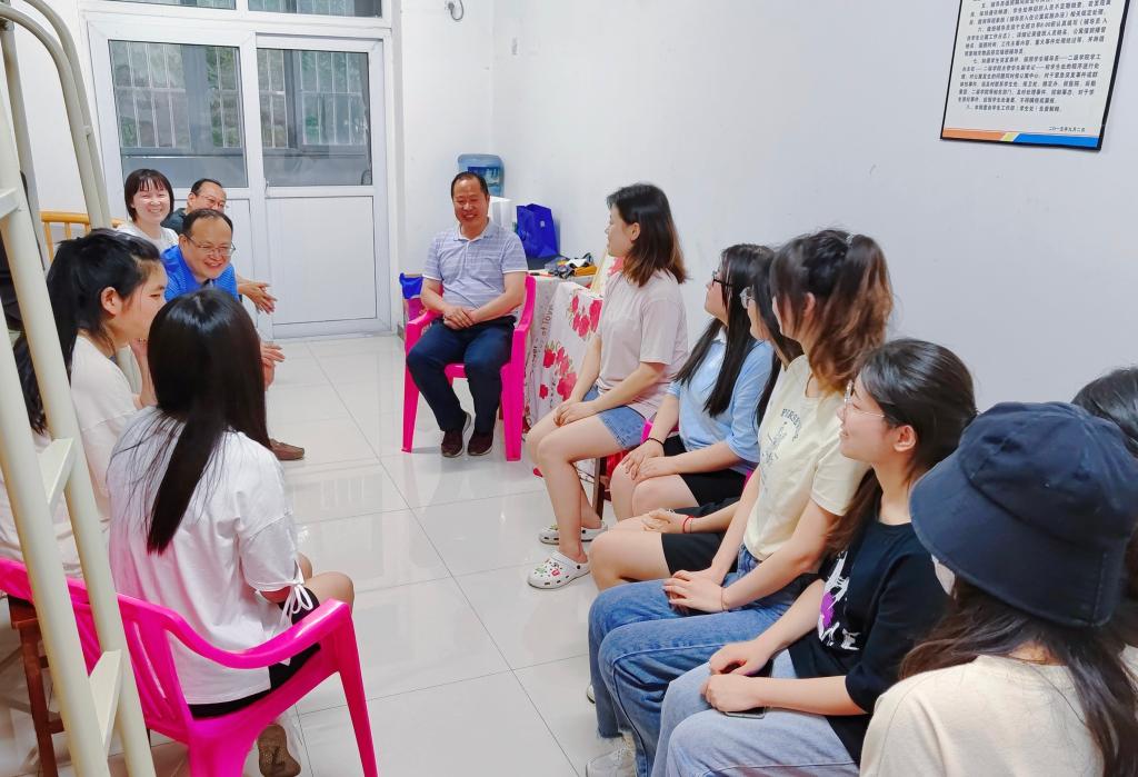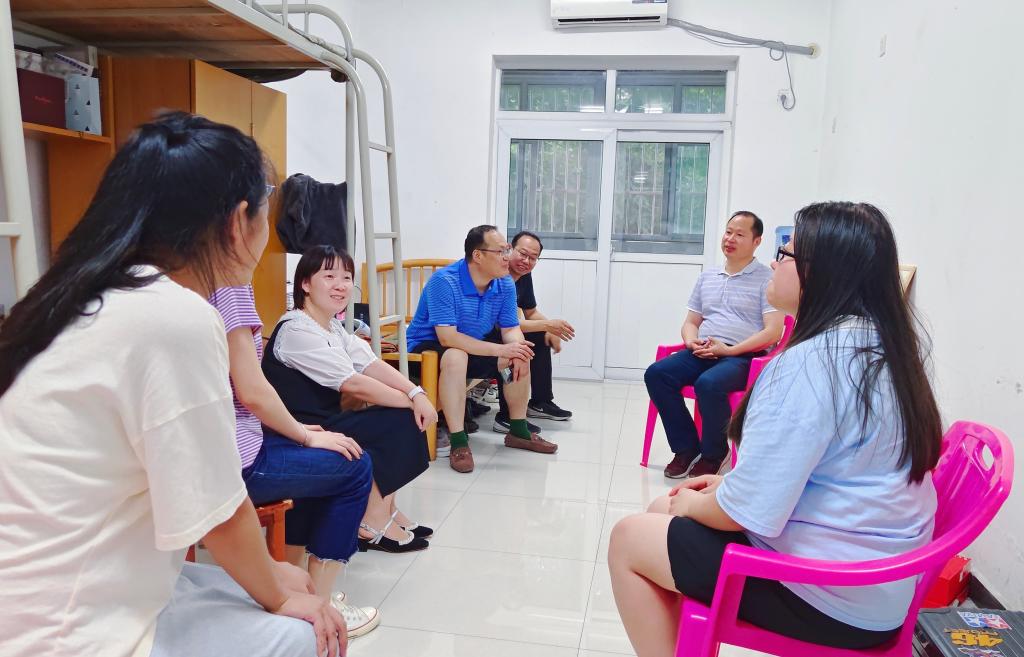 在12号公寓该院辅导员值班室,汪勇与汉语言文学专业部分毕业生亲切交谈,详细询问她们离校前各项事务的办理情况、行程安排、未来打算等。汪勇勉励毕业生要坚定理想信念,继承和发扬学校、人文学院良好的院风,秉承人文精神和人文关怀,站稳讲台,深耕教育,到祖国最需要的地方建功立业。他表示,母校会时刻关注毕业生的发展,做大家的坚强后盾,为毕业生的持续发展助力。同时,汪勇叮嘱同学们要坚持锻炼身体、珍爱生命、关爱家人,永远保持积极向上的心态,自立、自强、自律,努力成长为堪当民族复兴重任的时代新人。