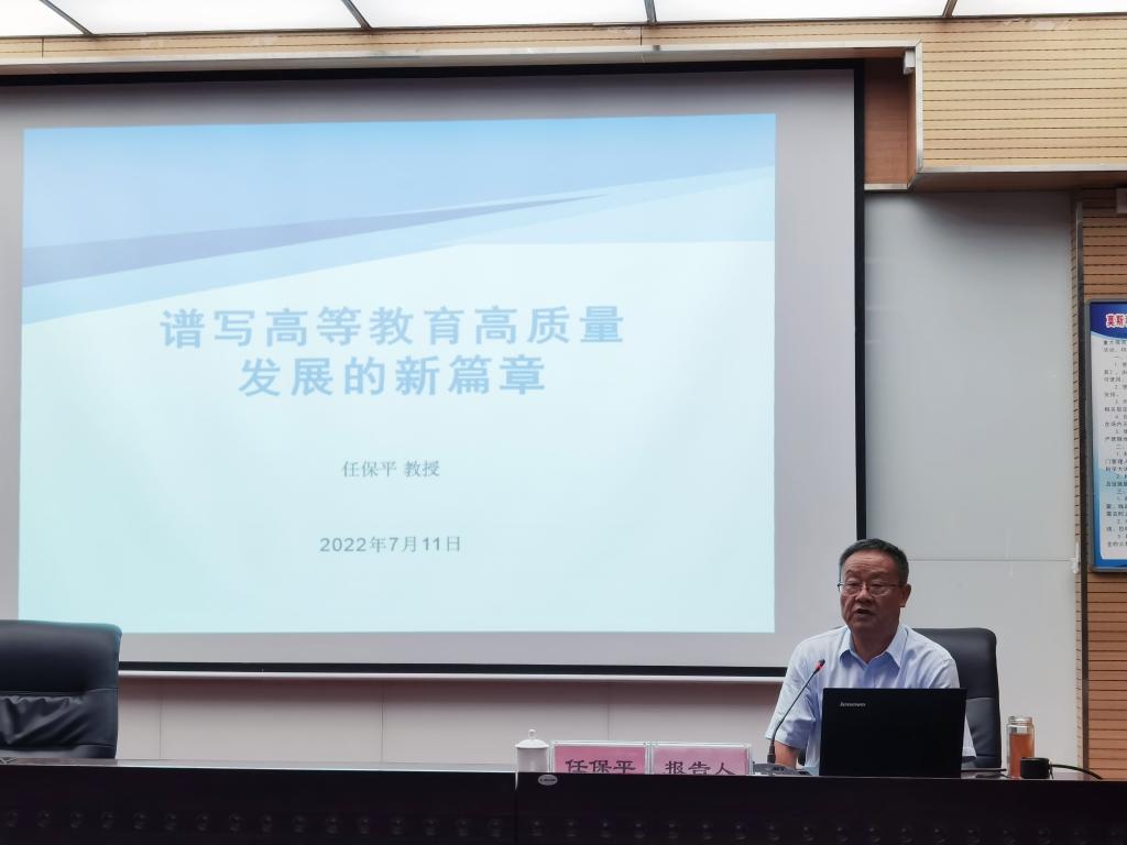 任保平以“谱写高等教育高质量发展的新篇章”为主题,分别从高等教育高质量发展的背景、高等教育高质量发展的提出、高等教育高质量发展的理念(五大理念:教学决定生存、科研决定水平、服务决定地位、质量决定兴衰、制度决定成败)、内涵与要求、高等教育高质量发展的内容和深化改革推动高等教育的高质量发展的路径等方面进行了详细的论述。
