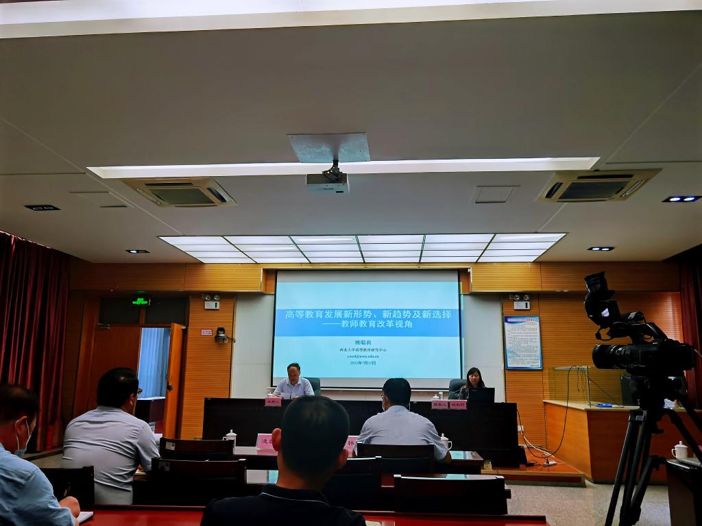 7月13日下午,西北大学高等教育研究中心主任、中国高等教育学会理事,陕西高等教育学会副会长、陕西高等教育研究与评估中心副主任、博士生导师姚聪莉教授为伟德官网干部做专题报告。报告会设科学大讲堂主会场,厚德楼第二会议室和一号教学楼1101教室两个分会场。党委副书记韩小卫,党委委员、宣传部部长李明敏及全体处科级干部参加报告会。报告会由党委委员、组织部部长凌朝栋主持。