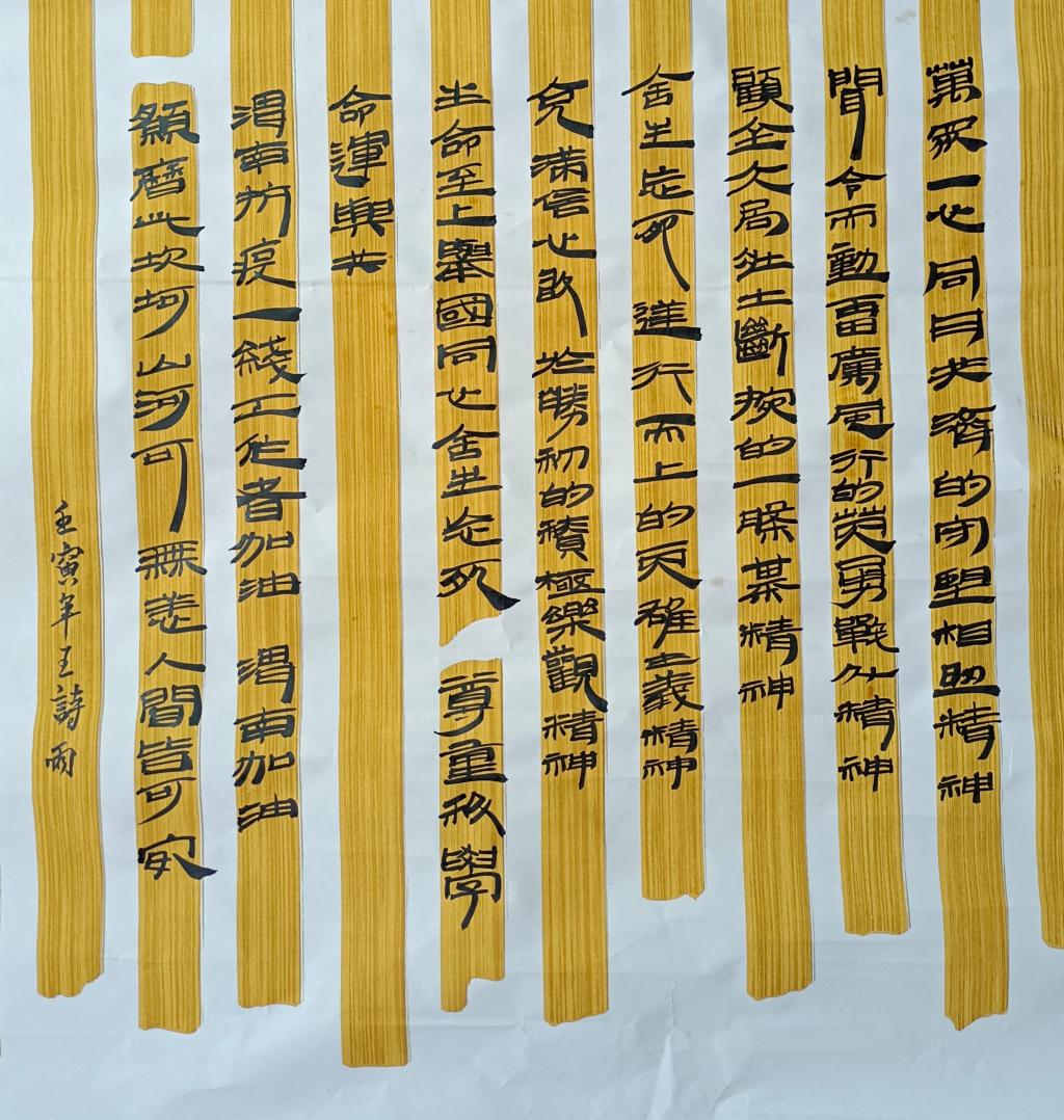 美术学院书法学专业和环境设计专业的同学,创作出以抗疫为主题的作品,用艺术再现和讴歌了“全民一心 守护渭南”的精神风貌,为打赢抗击疫情这场大仗贡献美术宣传力量。这些有情怀、有温度、有力量的作品,展示了学生众志成城抗击疫情的积极状态,表达了对奋战在抗疫一线工作者的感激。