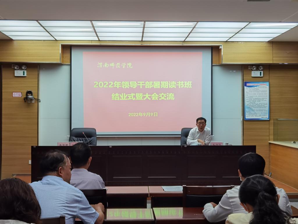 张守华结合此次读书班学习内容及分组讨论情况作总结讲话。他高度肯定了此次读书班的成效,并就如何贯彻落实好本次读书班会议精神,以实际行动推动学校事业高质量发展,他要求,要树立终身学习的理念,要知行合一抓落实,要知重负重、攻坚克难,要切实转变作风。他强调,全体处级干部要以这次读书班作为学习的新起点,作为工作的加油站,振奋精神、鼓足干劲,积极投身到学校各项工作中,着力推动学校内涵式建设和高质量发展,不断提高教育教学质量和办学治校水平,以优异成绩为党的二十大献礼!
