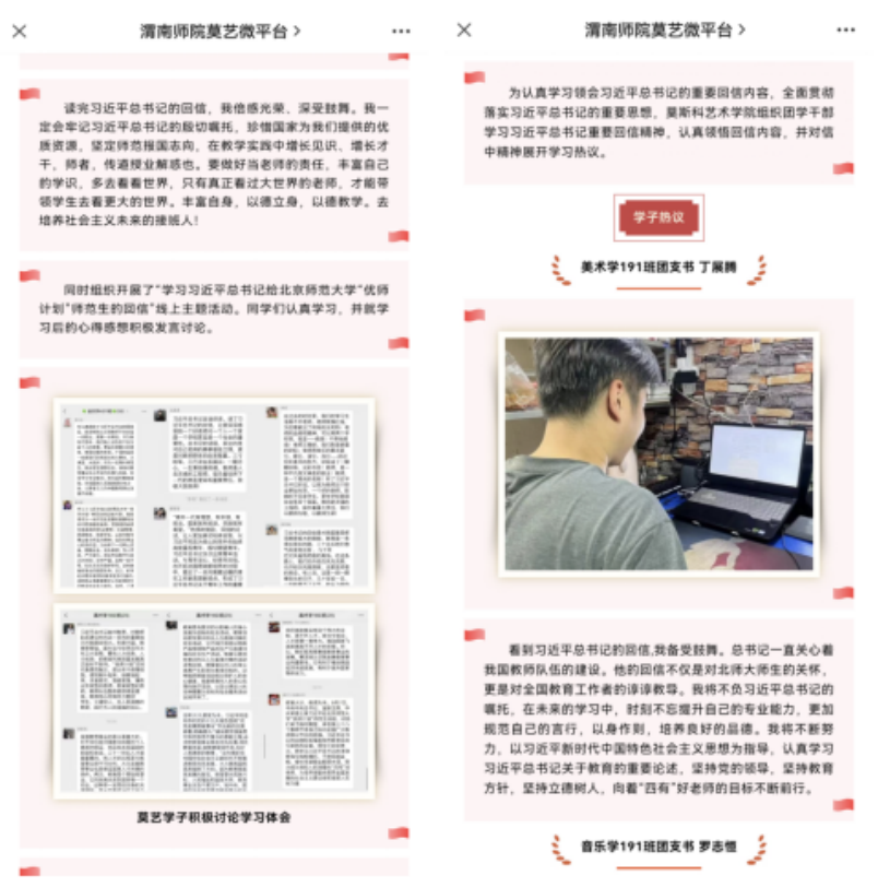 同学们表示,在宿舍与学校和学院领导一起学习,感到十分温暖,学习习近平总书记回信,深有感触,倍受鼓舞,她们结合在学校的学习收获以及暑期支教、兼职等社会实践经历,表示会在专业上不断提升自己,增长才干,为美育教育奉献一份热,散发一份光。
