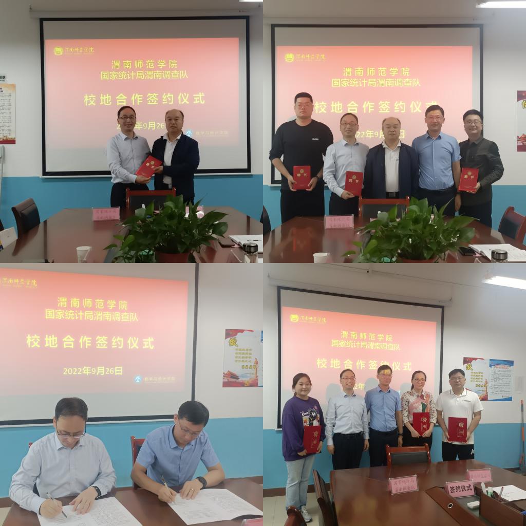 双方举行人员相互聘用,卢爱刚为国家统计局渭南调查队王力、谢延斌、梁杰发放聘书;马金阳为伟德官网数学与统计学院刘炳全、董晓萌、李凤发放聘书。马金阳和卢爱刚共同为实践教学基地揭牌。