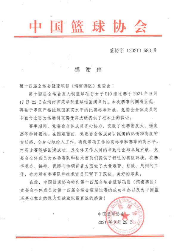中国篮球协会向十四运会篮球项目(渭南赛区)竞委会致感谢信
