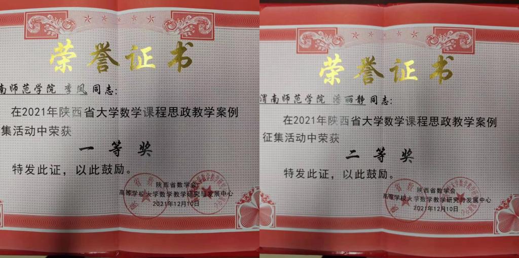 教师获得省级数学类课程思政教学案例一、二等奖