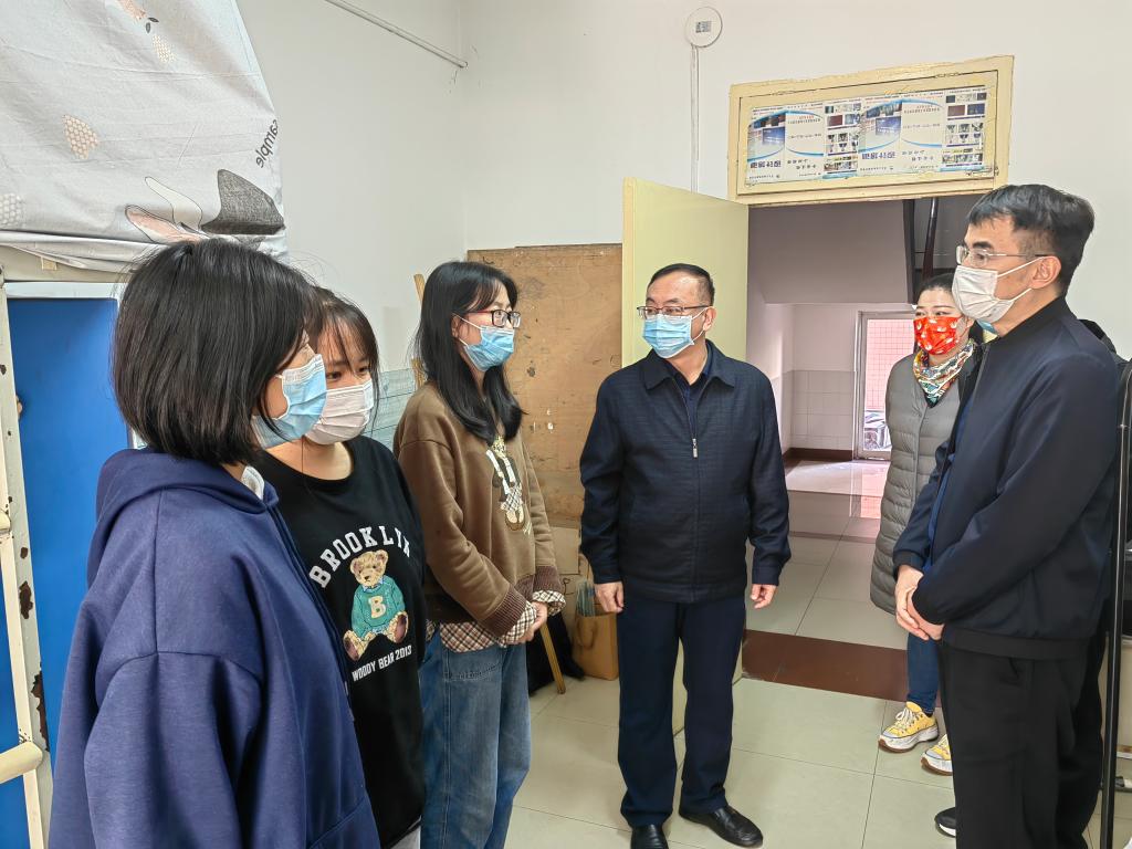 “家是哪里的?”“大家都是什么专业的?”“了解返校后静态管理的政策吗?”“吃饭问题是怎么解决的?”“每日体温监测是怎么做的?”“核酸检测有没有按时做?”“网课上得怎么样,能跟上老师的教学进度吗?”“线下课程转为线上课程,更要和老师勤沟通、多交流,确保学习效果不断线。”“有没有什么困难?”……袁亮走访正在静态管理中的学生时,与同学们亲切交谈,提醒大家一定要按时做好核酸检测,注意个人防护,认真上好网课,有困难及时向辅导员、任课教师等反馈。他鼓励同学们要调节好心理状态,明确学习目标,保持规律作息,劳逸结合,加强体育锻炼,提高身体素质,增强战胜疫情的信心。