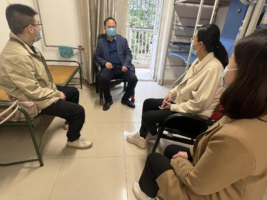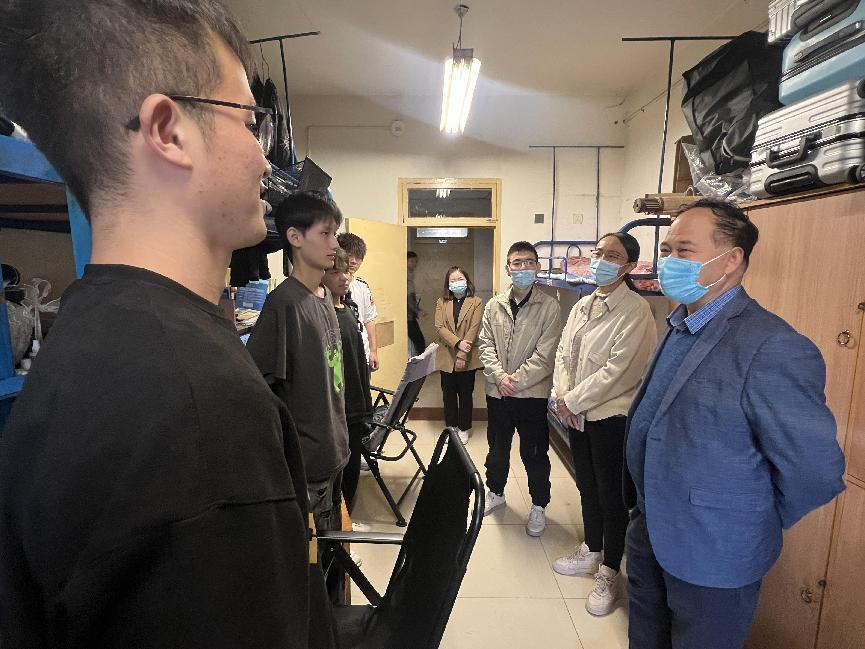 凌朝栋首先来到学生宿舍同学生亲切交流,了解学生近期学习生活情况,细心询问同学们近期线上学习、饮食等各个方面的情况,鼓励学生在做好线上课程学习的同时加强锻炼身体,提高个人综合素质,希望同学们严格遵守学校疫情防控管理规定,保持积极向上的精神状态,认真学习,劳逸结合,充实度过每天的学习生活。