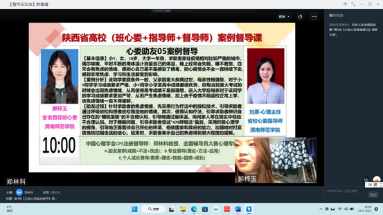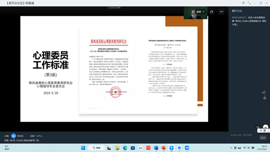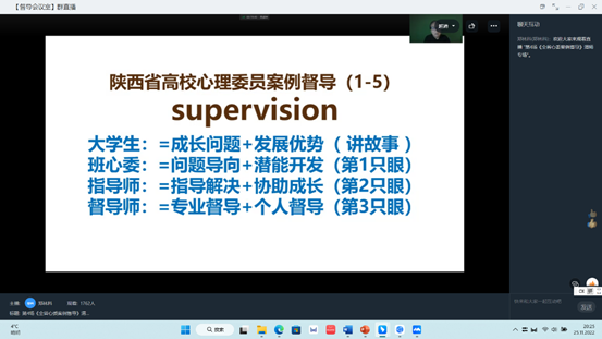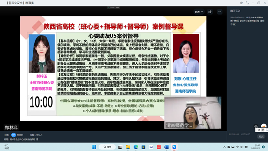 11月25日晚,“陕西省班级心理委员和指导师心理助人技能培训及案例督导——伟德国际1949官网省级标准心理健康教育中心专场”线上督导顺利进行。伟德国际1949官网百佳心理委员郝梓玉、最美班级心理委员季玮婷分享助人案例,最美百佳心理委员指导师刘原、最美心理委员指导师王琦珩进行指导。陕西省高校心理素质教育研究会会长、中国心理学会注册督导师郑林科进行督导。