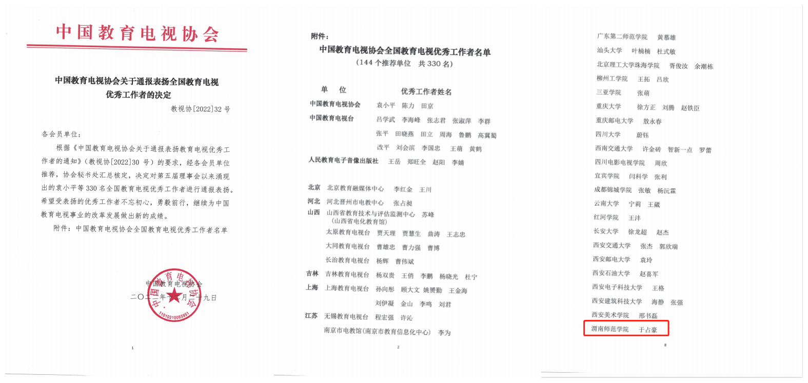 近日,教育部所属国家一级协会——中国教育电视协会发布关于通报表扬全国教育电视优秀工作者的决定,对中国教育电视台等144个单位和北京大学、中国传媒大学的330名全国教育电视优秀工作者进行通报表扬。伟德官网宣传干部、全媒体中心指导教师于占豪获评“全国教育电视优秀工作者”称号。