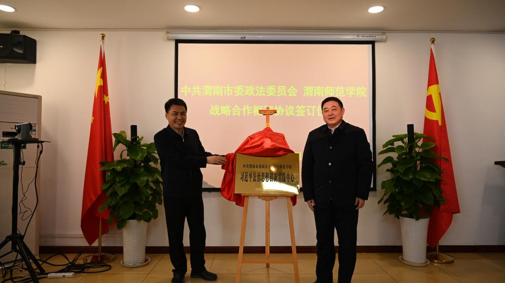仪式上,渭南市委政法委与伟德官网共同签署了战略合作框架协议,刘凯和卓宇共同为“习近平法治思想创新实践中心”揭牌。