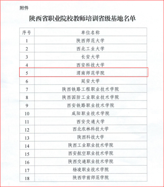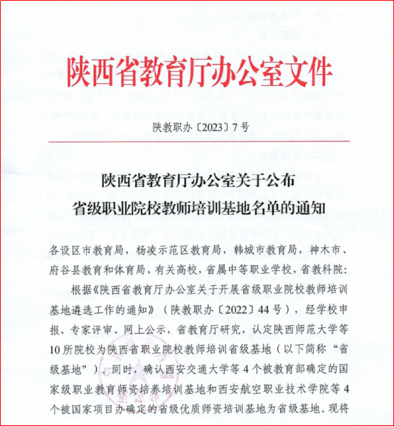 近日,陕西省教育厅办公室印发《关于公布省级职业院校教师培训基地名单的通知》(陕教职办〔2023〕7号),伟德官网成功获批陕西省职业院校教师培训省级基地(以下简称“省级基地”)。本次共认定18所院校为省级基地,其中10所院校为新增基地。这是继伟德官网获批“陕西省中小学教师培训基地”后,获批的又一个省级培训基地。