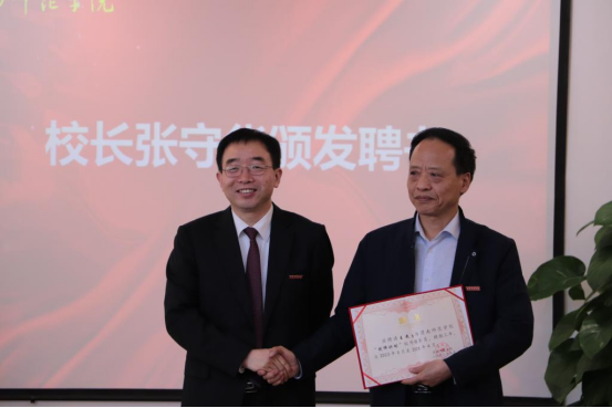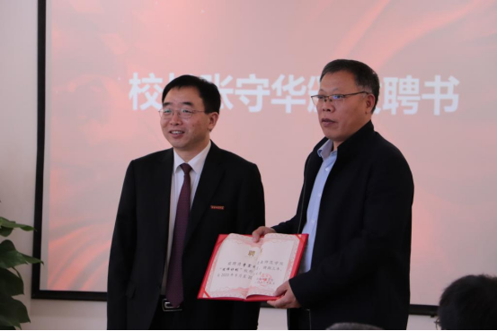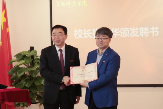 副校长王菊霞宣读聘任文件,聘任中国兵器工业集团国营第804厂党委书记、董事长代五四,重庆市委党校科研处处长、三级教授、国务院政府特殊津贴专家侯晋雄为兼职教授;聘任日联科技有限公司董事长刘骏为客座教授;聘任渭南市人大常委会秘书长、机关党组书记王杰生,韩城市教育局党组书记、局长、市政府总督学郑武军,灞桥区教育局局长曹宏顺,大荔县教育局党委委员、副局长、大荔中学校长周明为“优师计划”校外辅导员。校长张守华代表学校颁发聘书。