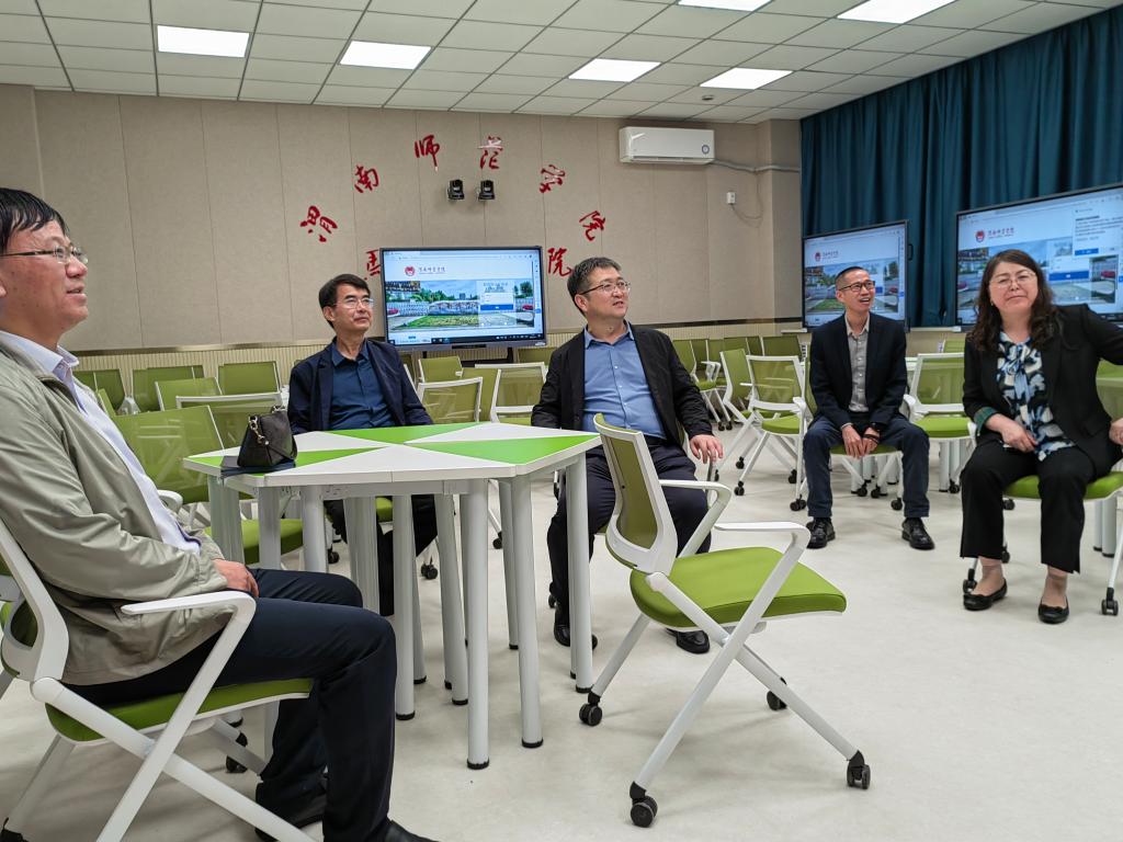贾小军向王彬武介绍了智慧教室建设的基本情况。创维管理人员从智慧教室的建设理念、涵盖类型、教学平台、系统功能等方面进行了现场讲解与演示。参观过程中王彬武与陪同参观人员就教学资源建设、师范生教学能力培养、课堂创新等问题进行了交流探讨。