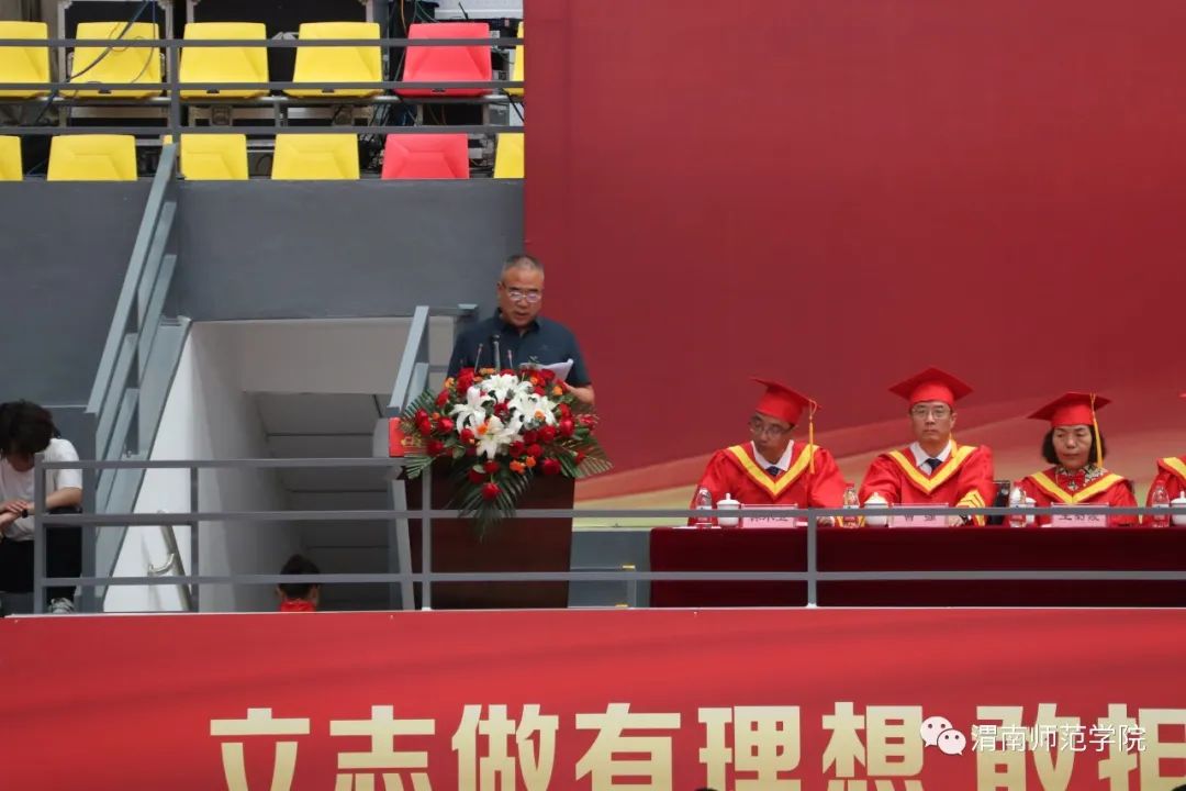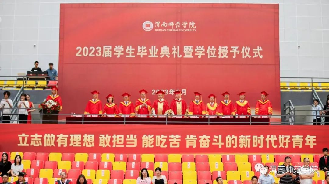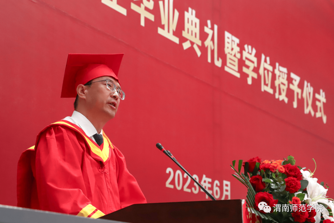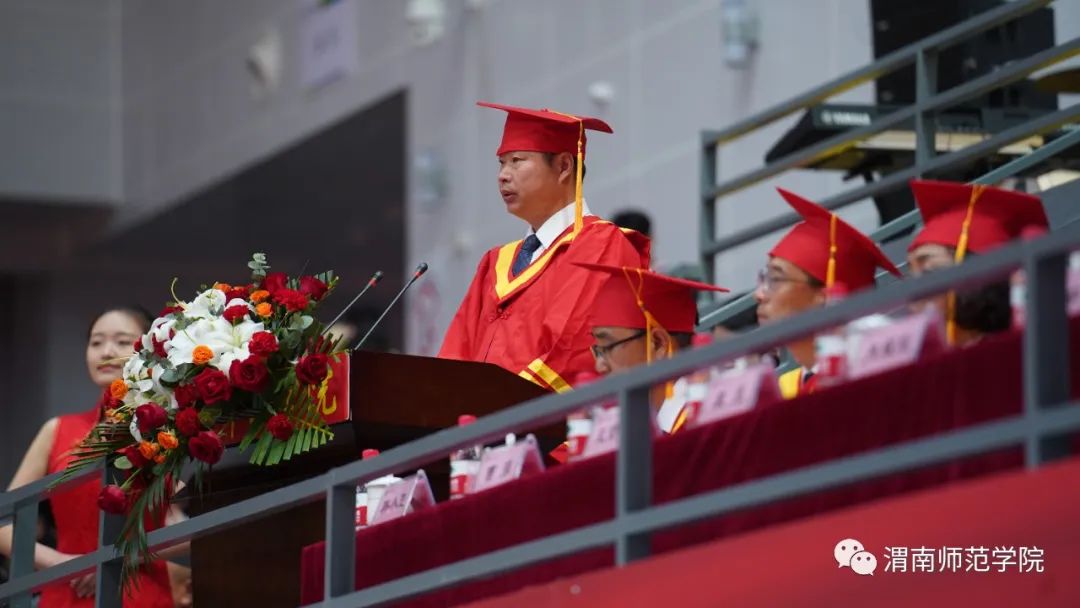 校长张守华在致辞时勉励2023届全体极其幸运、历尽艰辛而又光彩熠熠的毕业生“后生”“后浪”们,要接续奋斗,不负时代,珍惜青春韶华,将“青春梦”融入“中国梦”,怀揣与时代同步伐、与人民共命运的伟大志向,树立为祖国为人民永远奋斗、赤诚奉献的坚定理想;要艰苦奋斗,砥砺前行,秉承渭师人育人为本、为国担当、艰苦创业、勇争一流的优良传统,知重负重,“不甘人后、奋起直追”;要顽强奋斗,站稳讲台,能够在新技术奔涌而来之际,做时代的参与者,勇立潮头,做“四有好老师”,在强国建设的事业中、民族复兴的伟业中,不断贡献青春的力量。