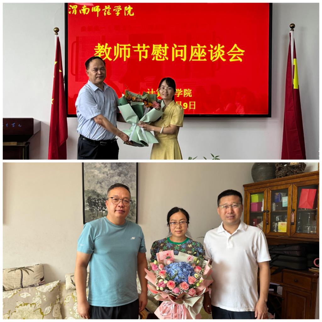 凌朝栋、李明敏分别带队慰问了计算机学院的贾花萍老师、音乐学院的顾晓莹老师,充分肯定了她们在教书育人工作中取得的成绩,并对她们一直以来立足教学一线、深耕教坛表示感谢,希望她们能够继续关心关注学校发展,努力培养更多德智体美劳全面发展的社会主义建设者和接班人。