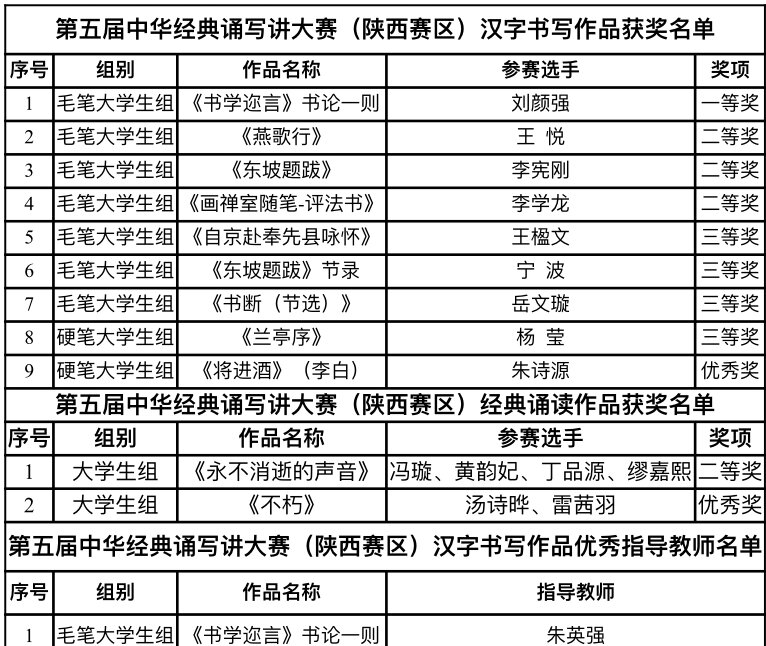 近日,陕西省教育厅公布了第五届中华经典诵写讲大赛“诵读中国”经典诵读大赛和“笔墨中国”汉字书写大赛两个赛项的省级比赛作品评选结果,伟德官网学生参赛的作品荣获大学生组一等奖1项、二等奖4项、三等奖4项、优秀奖2项。美术学院教师朱英强获毛笔书法汉字书写大赛优秀指导教师奖。