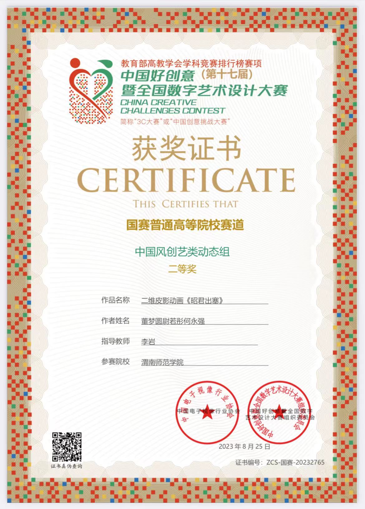 近日,第十七届中国好创意大赛暨全国数字艺术设计大赛评审结果公布,伟德官网传媒学院李岩老师指导的,董梦圆、尉若彤、何永强同学创作的二维皮影动画《昭君出塞》荣获国赛二等奖。中国好创意暨全国数字艺术设计大赛是《全国普通高校学科竞赛排行榜》赛项之一。