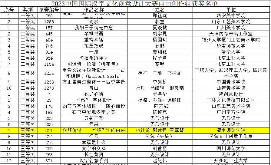 本次大赛由中国文字博物馆、清华大学美术学院、南京艺术学院联合主办,吸引了国内外众多参赛者,共计收到作品1409件,符合规定作品1302件,其中命题创作组368件、自由创作组934件。经过大赛评审委员会和监审委员会的严格评审,最终决出各类奖项:命题创作组一等奖2名、二等奖5名、三等奖10名、入围奖30名;自由创作组一等奖2名、二等奖10名、三等奖40名、入围奖100名;优秀组织奖10名;优秀指导奖39名。(通讯员 陈栋 审核人 曹熙斌)