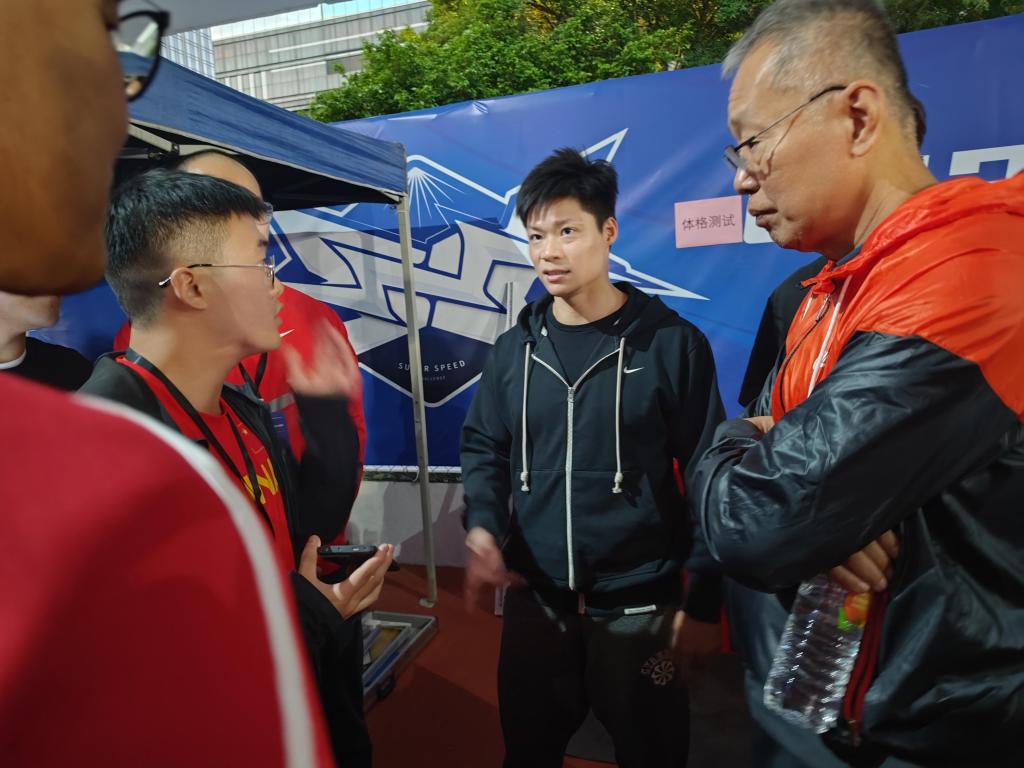 在测试结束后,亚洲飞人、暨南大学体育学院教授苏炳添参观测试现场,对大家工作给予肯定。田文博同学向苏教授展示了团队最新开发的AI田径技术分析小程序,苏教授给予肯定并提出改进建议。