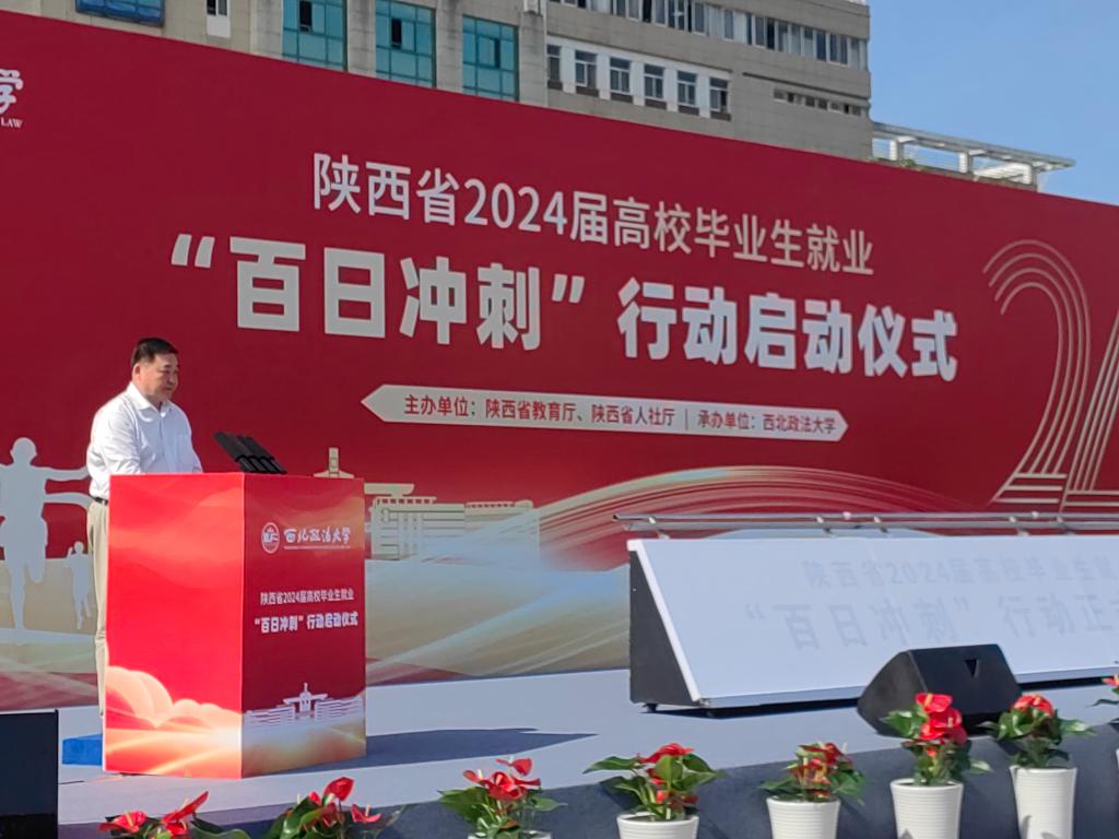 5月21日,陕西省教育厅、陕西省人力资源和社会保障厅在西北政法大学举办2024届陕西省高校毕业生就业“百日冲刺”行动启动仪式。党委书记卓宇在启动仪式上作交流发言。