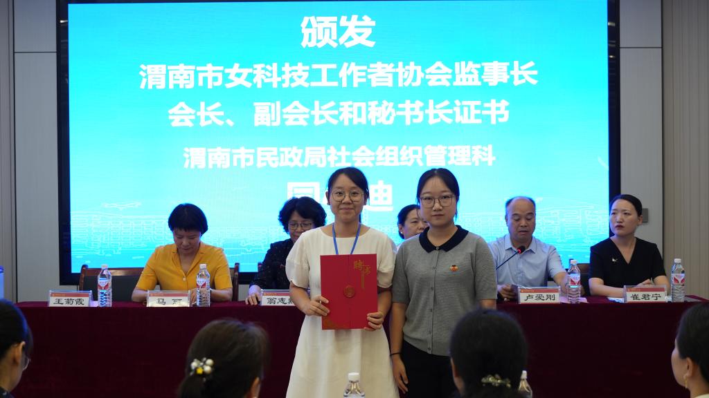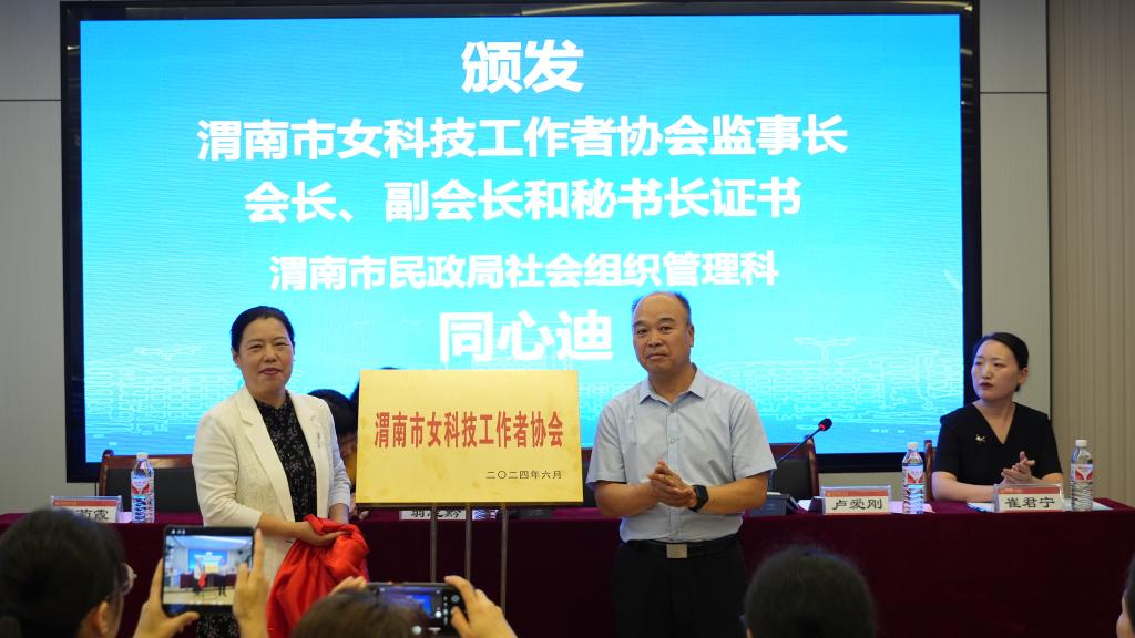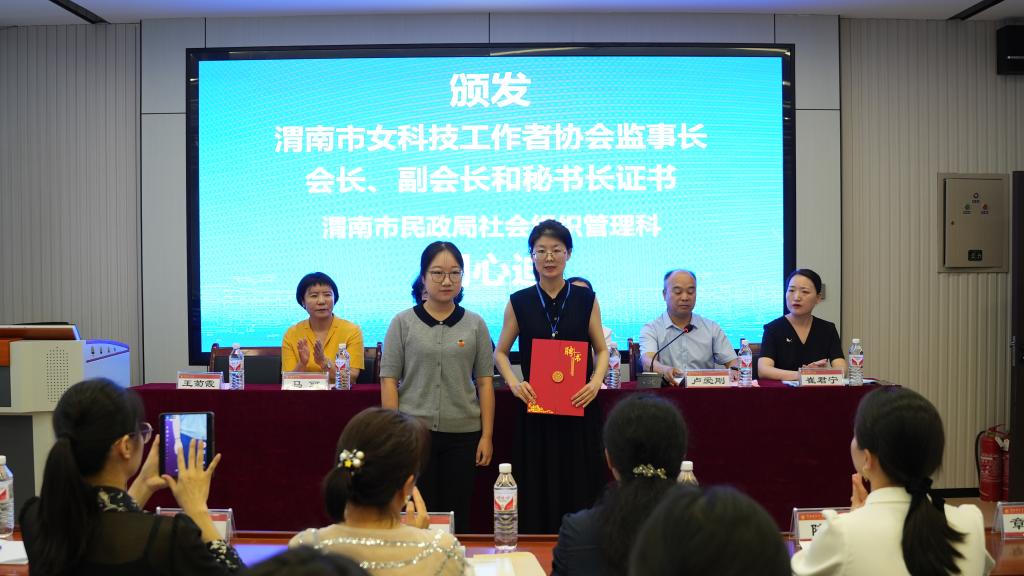 渭南市民政局社会组织管理科干部同心迪为渭南市女科技工作者协会副会长颁发证书