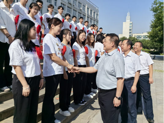 会前,卓宇书记在厚德楼前与每一位志愿者亲切握手并合影留念。
