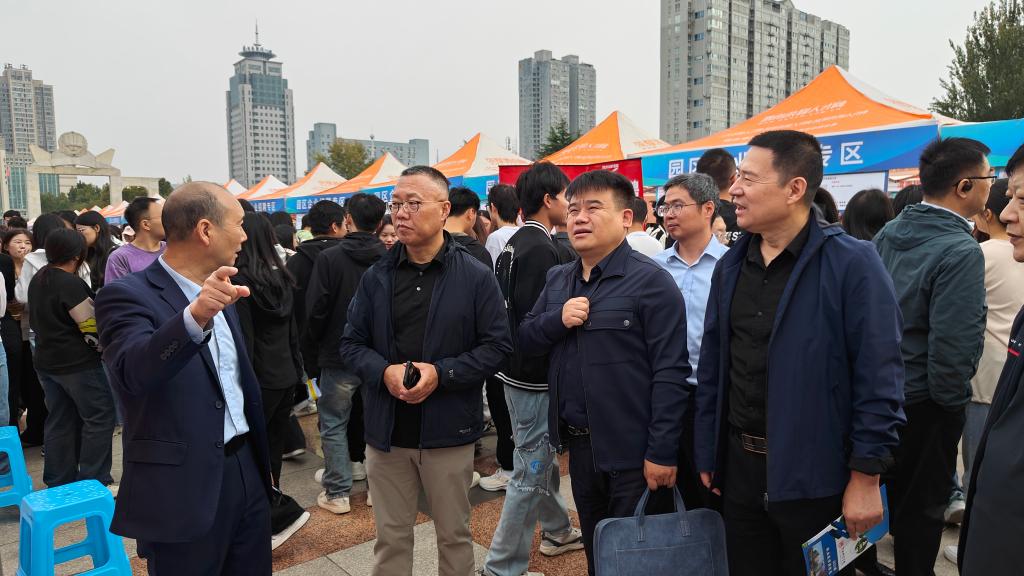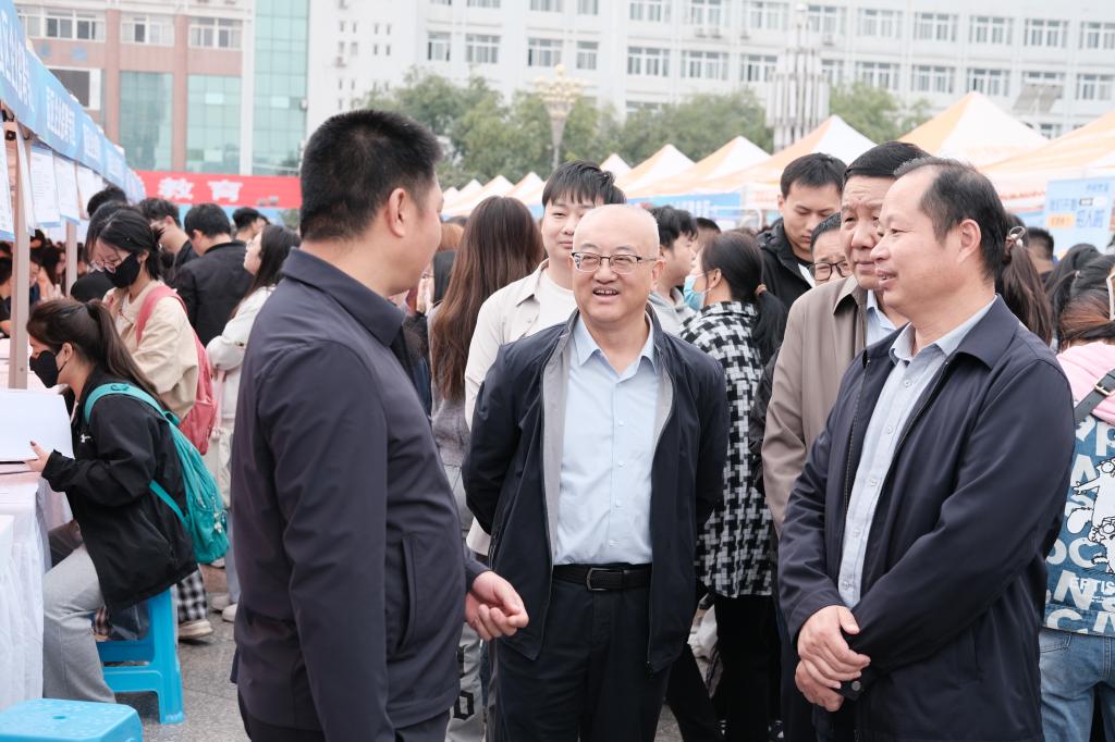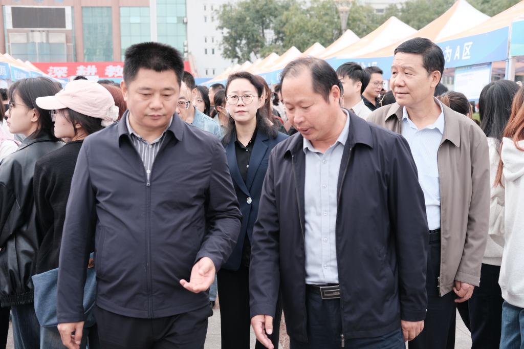 学校党委副书记、纪委书记、监察专员肖耀刚,党委副书记汪勇、袁亮,陕西省人社厅就业促进处二级调研员谌能仁,陕西省人才交流服务中心副主任武艳,渭南市人社局二级调研员董建明等共同深入招聘会现场指导,与参会企业及应聘毕业生深入交流。
