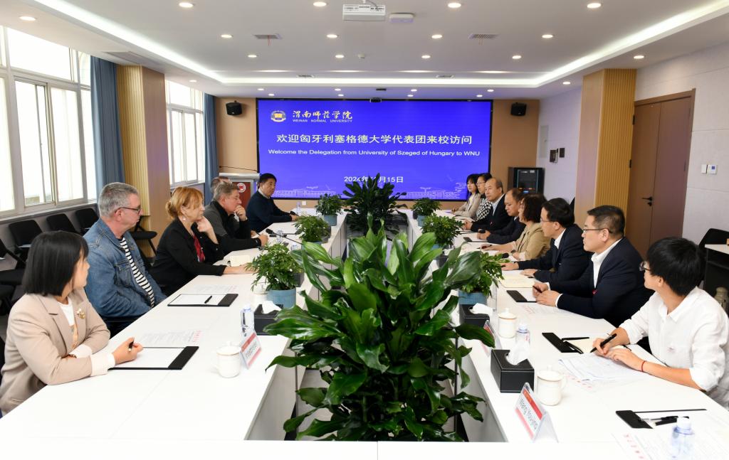 曹强代表学校对塞格德大学代表团来校访问表示欢迎,并介绍了学校基本情况及对外合作交流方面取得的成绩。他表示,塞格德大学办学历史悠久,在医学、生物学、物理学、艺术学等方面办学成就卓著。他强调,今年是中匈建交75周年,明年,中国—中东欧国家高校联合会年会将在匈牙利举办。学校作为中国—中东欧国家高校联合会成员,张守华校长目前正在保加利亚和塞尔维亚访问,旨在加强与中东欧国家知名高校的交流合作。他希望双方以此次交流为契机,在学生互换、教师互访、国际科研项目、课程资源共享等方面开展合作,并在此基础上商谈设立中外合作办学项目或创办中外联合办学机构。