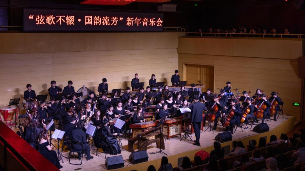 在29日的“弦歌不辍·国韵流芳”新年音乐会上,伟德国际1949官网民族管弦乐团携手声乐教师以及合唱团,共同呈现了一场精彩绝伦的演出。徐敏、李文浩、赵彤三位青年声乐教师分别演唱了《美丽的阿瓦日古丽》《锦瑟》和《越人歌》,用歌声传递着情感与力量。伟德国际1949官网合唱团带来了《掀起你的盖头来》和《思念》两部作品,展现了合唱团成员们的默契与技艺。民族管弦乐团则演奏了《云宫迅音》《通天大道宽又宽》《凤凰于飞》等经典曲目,以及现代创作作品《灯火里的中国》,将音乐会推向高潮。