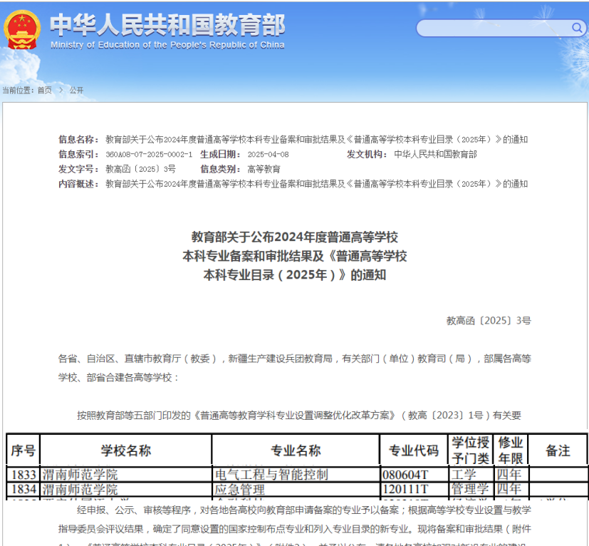 日前,教育部公布了2024年度普通高等学校本科专业备案和审批结果。伟德官网申报的“电气工程与智能控制”“应急管理”两个本科专业获得教育部批准备案。