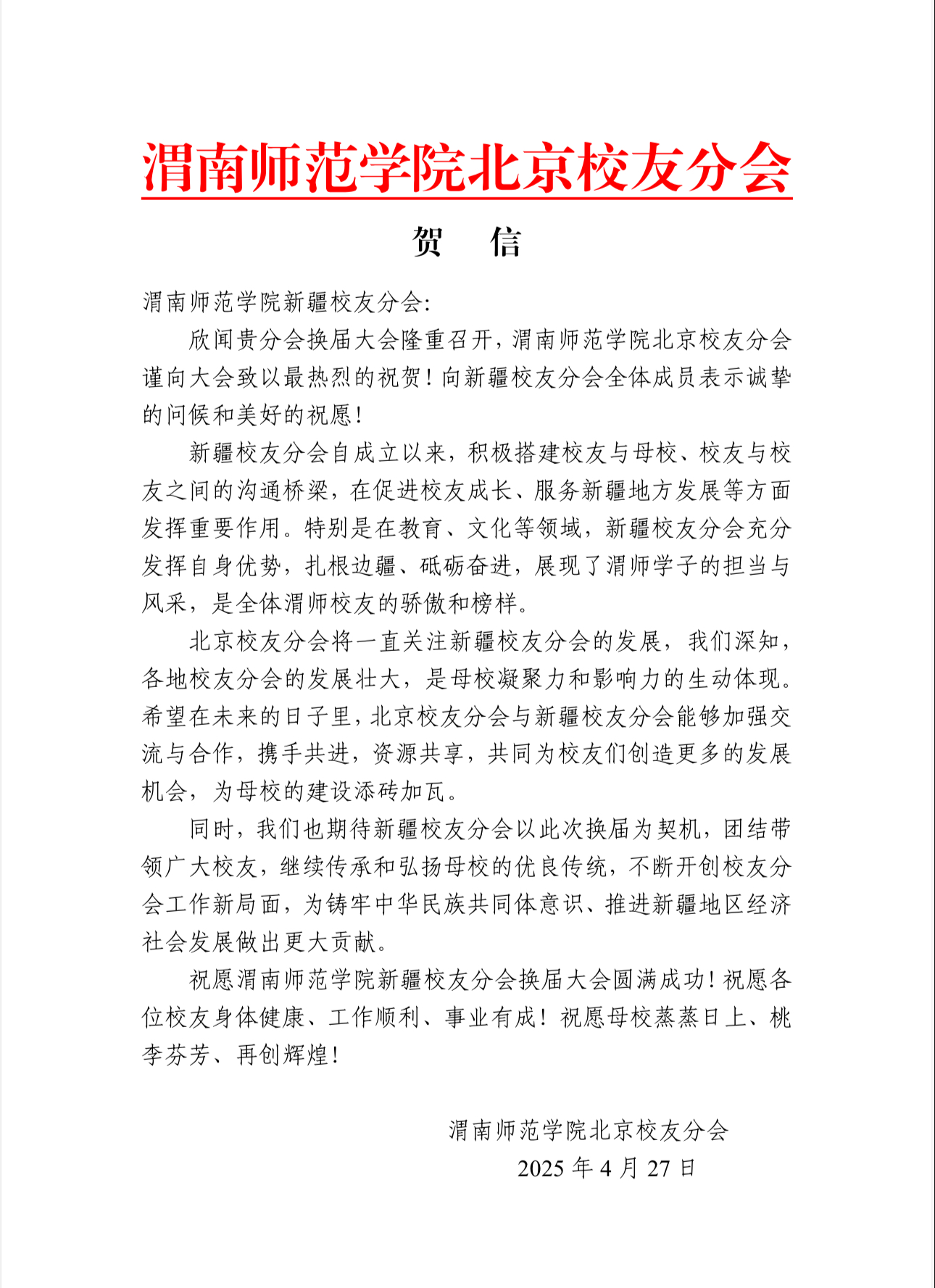 面对新一届新疆校友分会,他表示,要守正创新:把过去好的经验传承下来,同时不断借鉴新的方式,为校友、为新疆、为母校多做贡献,发挥好校友会平台、桥梁、纽带和把关作用;要勇担使命,校友会要进一步弘扬学校天天奋斗、天天快乐的学校精神,讲好渭师人的故事,展示渭师的良好形象。他说,每一个人的光辉都在铸就着母校的辉煌,要胸怀大爱,新疆不仅是祖国的边疆,更是面向中亚的桥头堡,要为祖国的强国建设、民族复兴伟业不断奋斗。希望各位前辈校友毫无保留地对刚到新疆的年轻校友给予支持与帮助,让他们能够更好地成长成才,更多地为新疆、为母校、为祖国多做贡献。