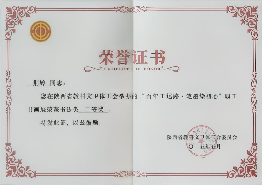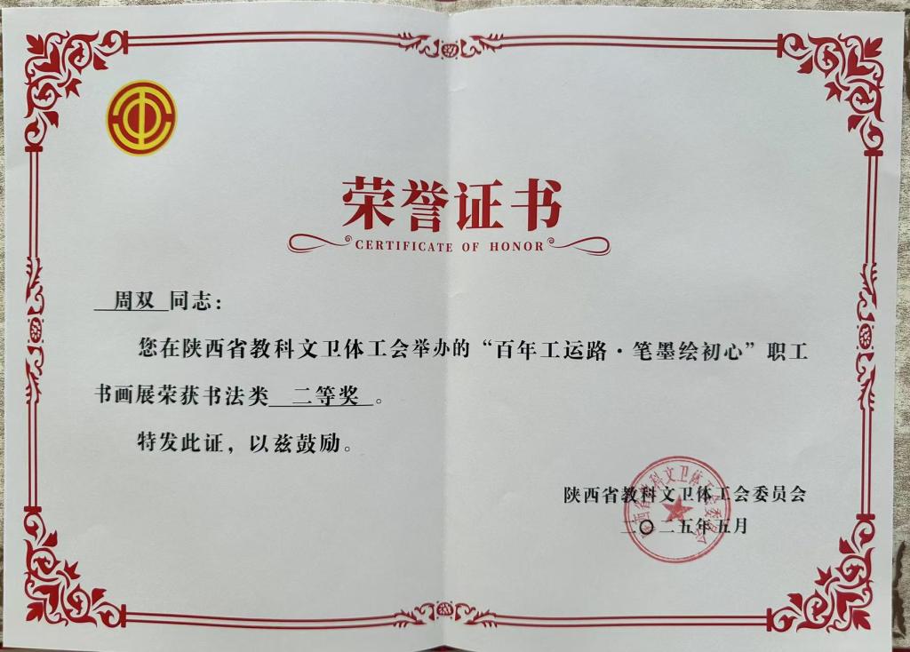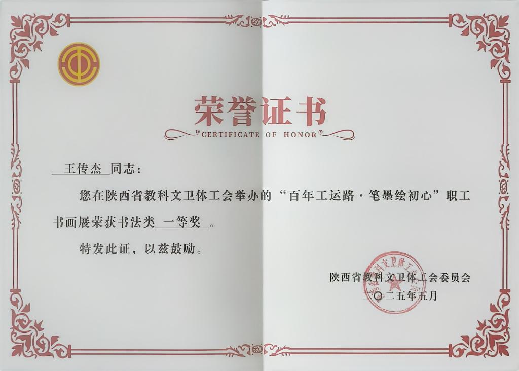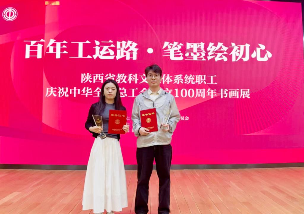 5月9日,在陕西省教科文卫体工会主办的“百年工运路 笔墨绘初心”陕西省教科文卫体系统职工庆祝中华全国总工会成立100周年书画展上,伟德官网教师从全省一千余件参赛作品中脱颖而出,美术学院王传杰、传媒学院周双、美术学院荆婷分获一、二、三等奖。